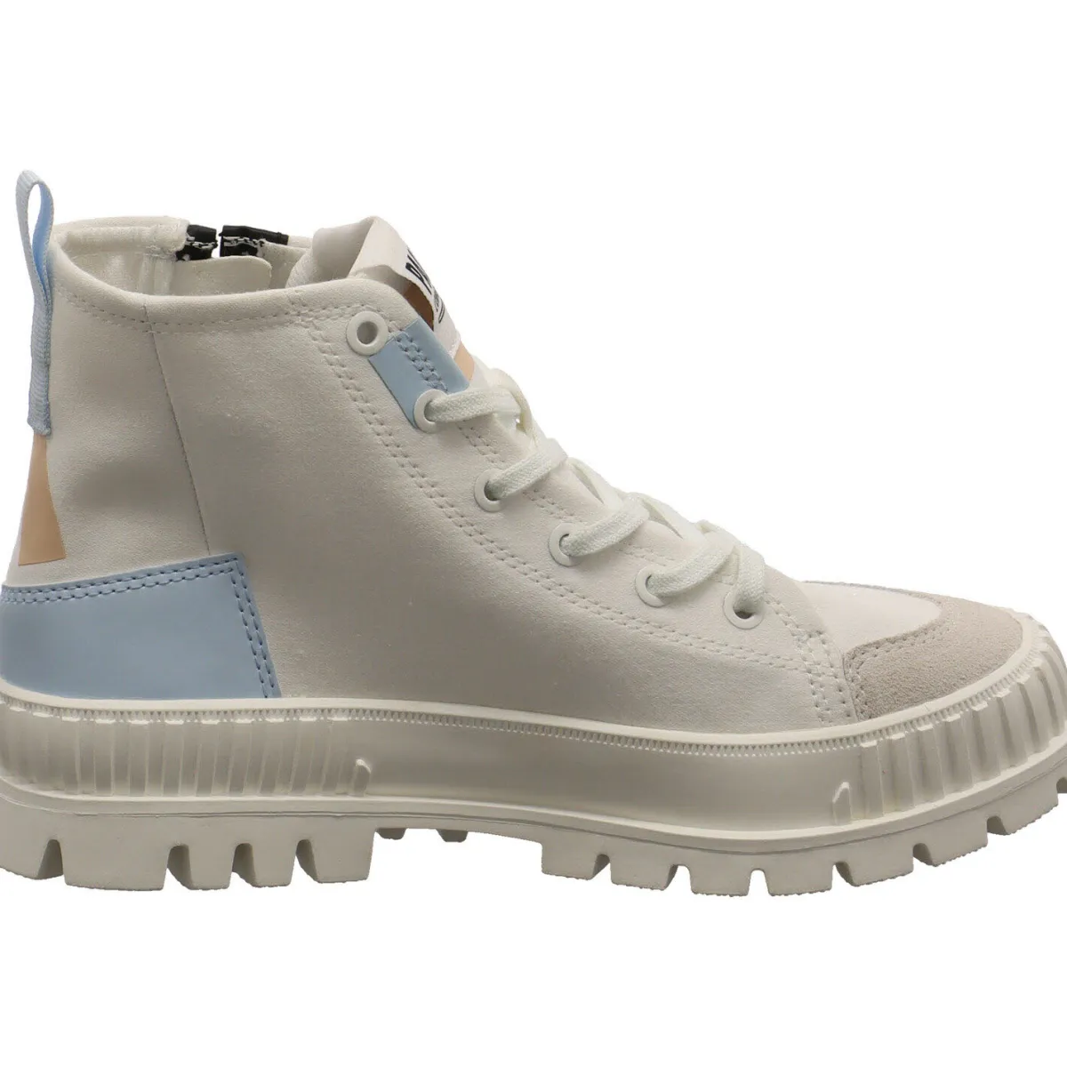 Das Obermaterial aus weicher Bio-Baumwolle in Weiß, ist robust und dennoch flexibel. Highlights sind das Gummi Logopatch und die Supply-Details im in Orange und Blau. Ein weiteres Highlight ist der seitliche Reißverschluss in Schwarz, mit dem du ganz leicht in den Schuh kommst.