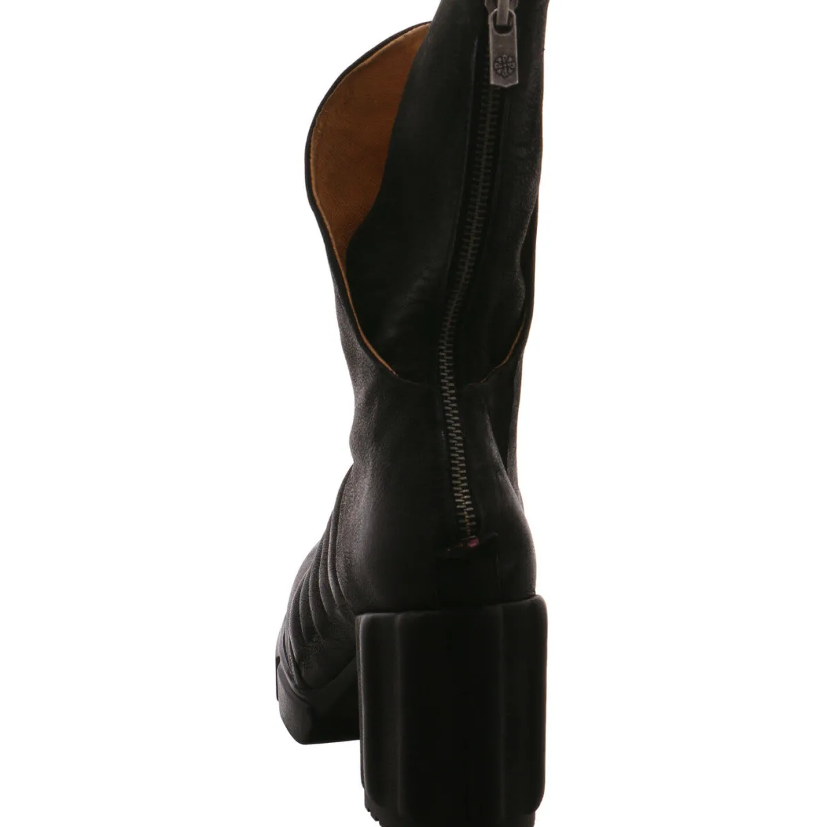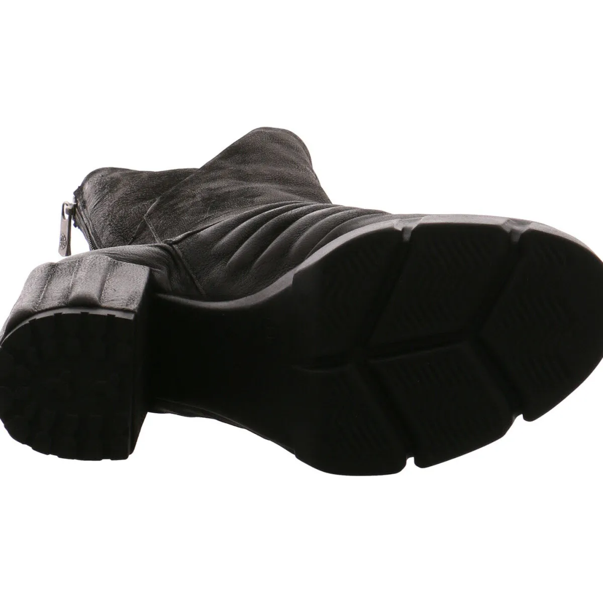 Gefertigt aus weichem Echtleder in Schwarz, fällt sie sofort durch ihre individuelle Schnittführung und die besondere Faltenlegung am Rist ins Auge. Diese findet sich am stabilen Blockabsatz wieder, der lange Beine zaubert und perfekt zum Look paast. Durch den Reißverschluss an der Rückseite vom Schaft ist das An- und Ausziehen unkompliziert. Die kräftige Laufsohle gibt guten Halt.