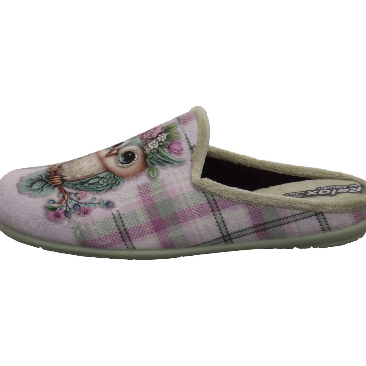 Er wurde aus angenehm weichen Textil in Grün gefertigt und ist mit einer süßen Eule mit Blumen auf dem Kopf und Glitzer verziert. Hinterlegt ist dieses süße Motiv mit einem Karo Muster in Grün mit Lila. Die Innensohle ist angenehm gepolstert und trägt zum Wohlfühlmoment bei. Die Gummisohle gibt perfekten Halt, so kommst du auch auf glatten Böden nicht ins Rutschen.