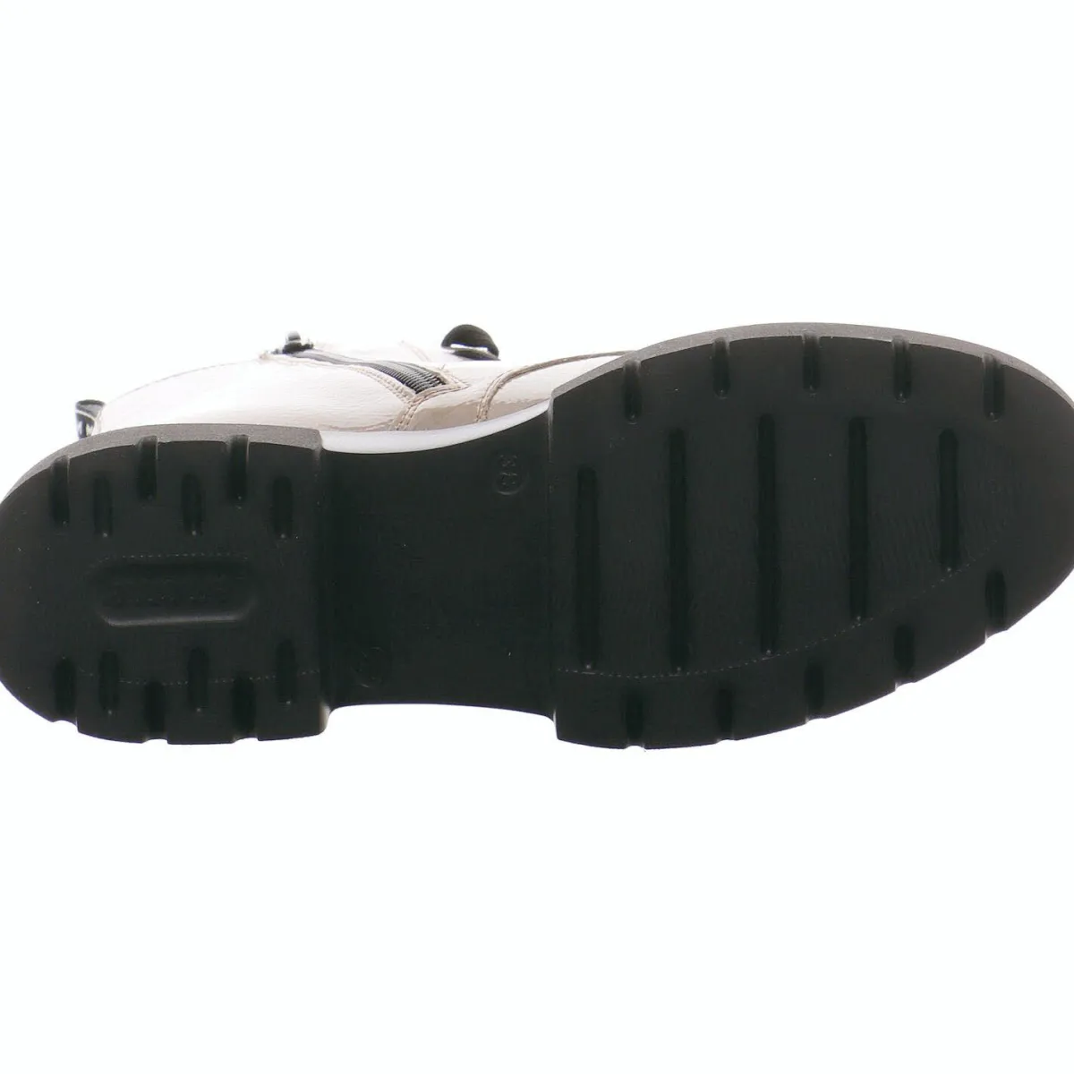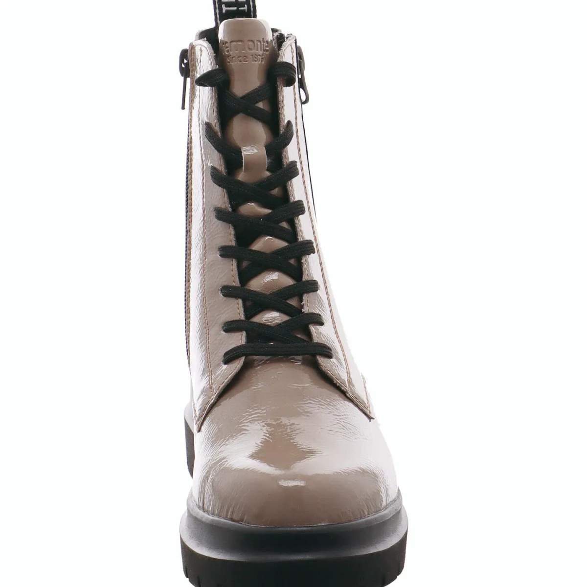 Gefertigt aus hochwertigem Echtleder in Beige in Lackoptik fungiert der Schuh als schicker Eyecatcher. Ein tolles Detail ist der in Schwarz gestaltete Zipper an der Außenseite.