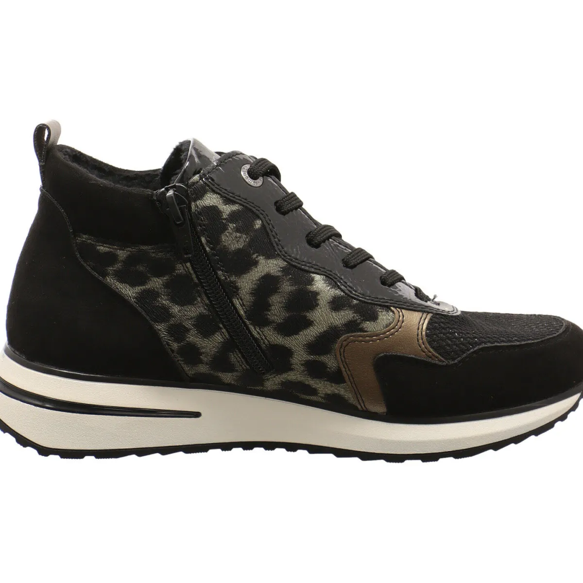 Das Obermaterial in einem gekonnten Mix aus Textil und Synthetik in Schwarz, ist mit einem Glitzerschimmer auf dem Mesh Gewebe versehen. Seitliche Einsätze in Bronze und ein Animal Leo Print und die Umrandung der Schnürsenkelösen in Lack, runden den modischen Look perfekt ab.