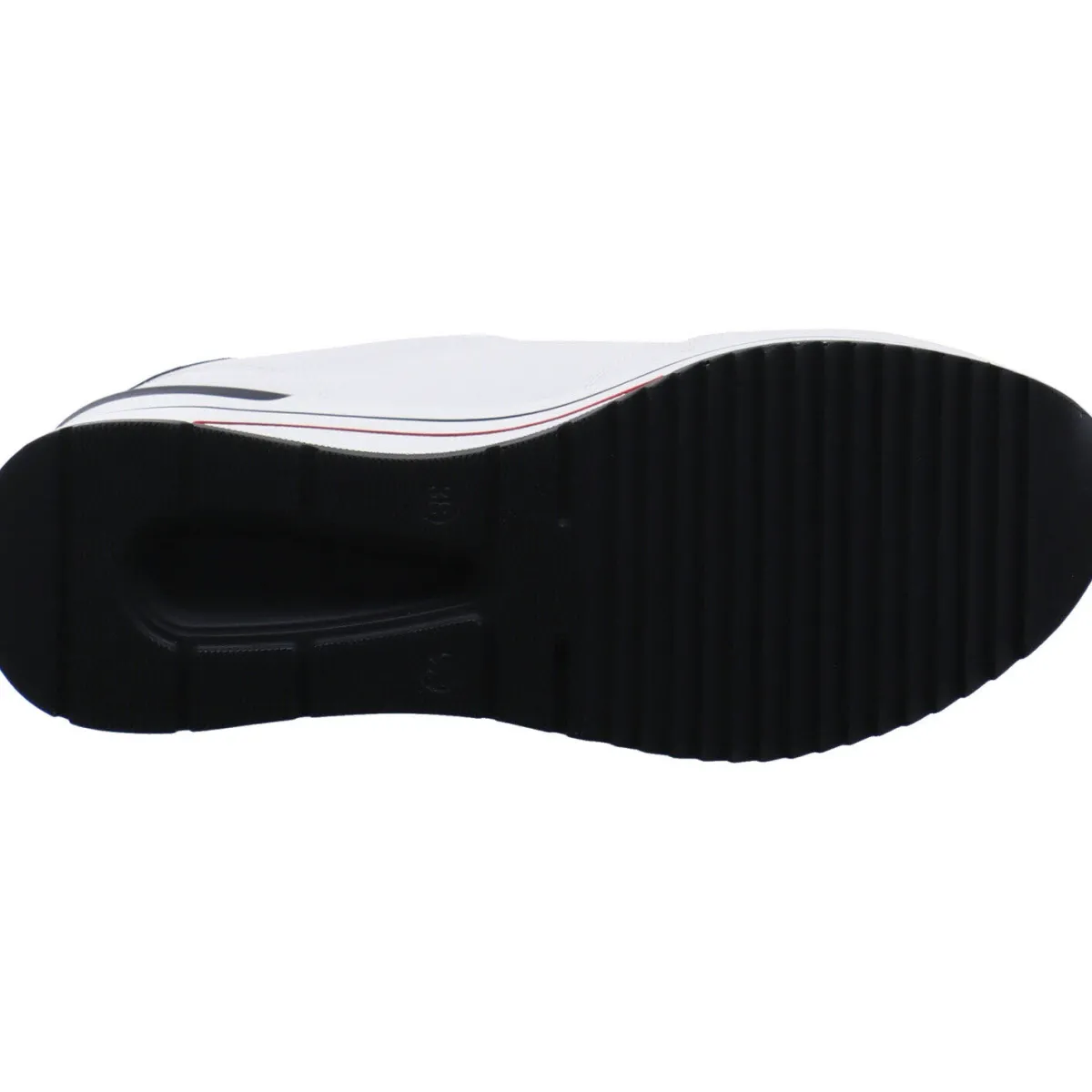 Das Obermaterial aus Leder in Weiß, ist auf dem Blatt mit einer Perforierung versehen. Tolle Details an der Ferse sowie am Schaft sind die Einsätze in dunklem Blau, die Ziernähte in Rot und das Remonte Markenlogo an der Seite des Schuhs.