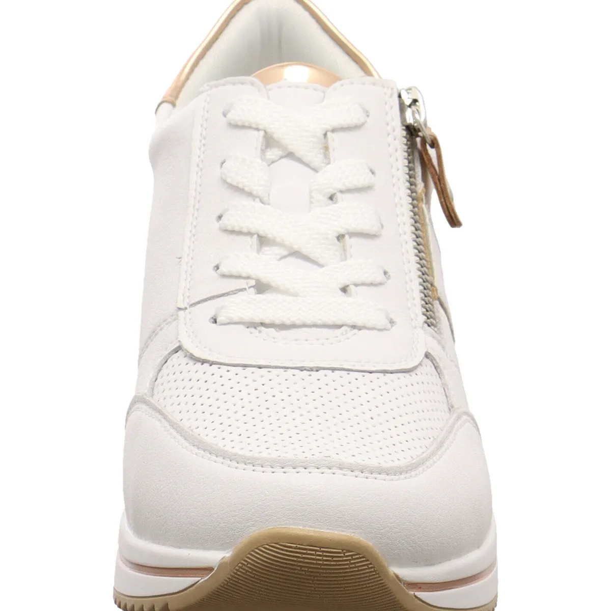 Das Obermaterial aus Leder in Weiß, ist auf dem Blatt mit einer Perforierung versehen. Tolle Details an der Ferse sowie am Schaft sind die Einsätze in einem Rose Gold, die Ziernähte und das Remonte Markenlogo an der Seite des Schuhs.