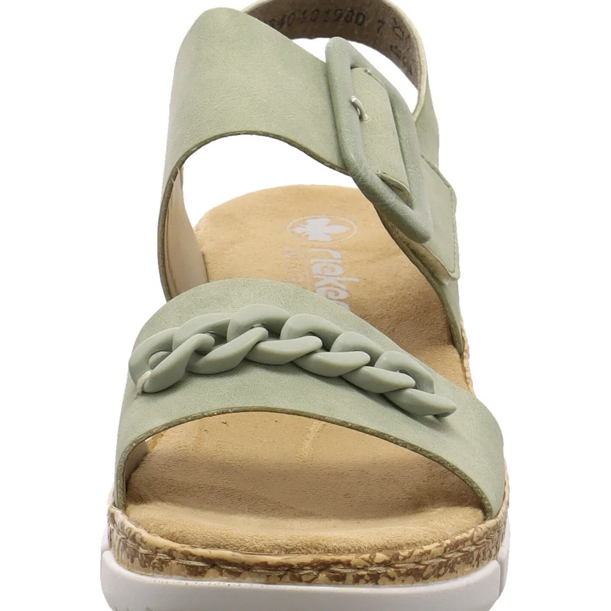 Das pflegeleichte Obermaterial aus authentisch genarbtem Kunstleder in Pistazien Grün bildet zusammen mit der großen Kunststoffschnalle ein optisches Highlight. Die Applikation auf dem vorderen Riemen macht den Schuh zum absoluten Hingucker.