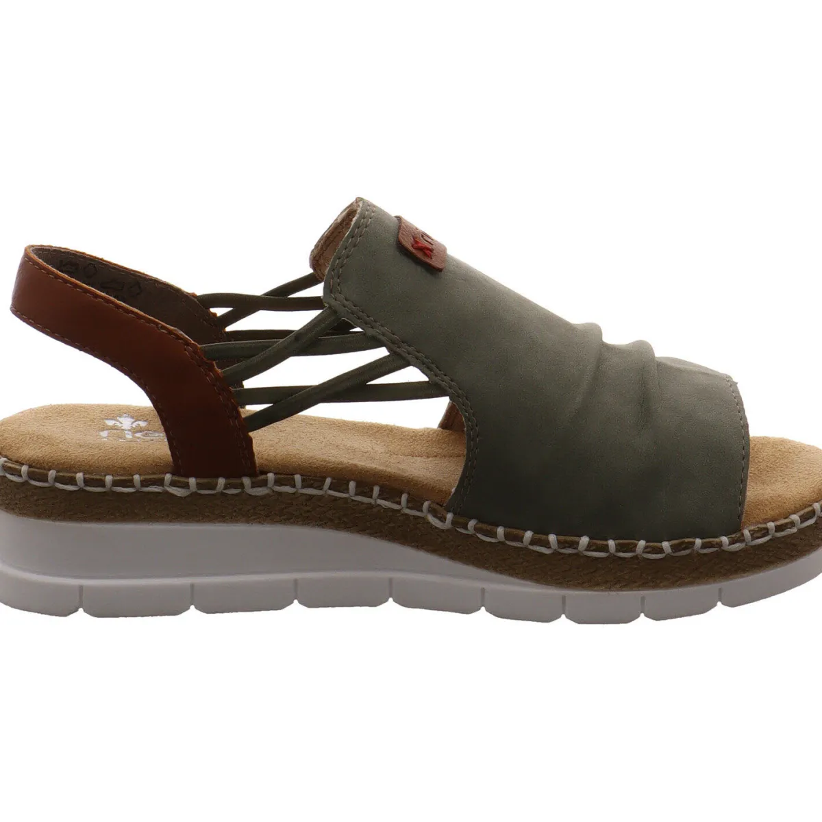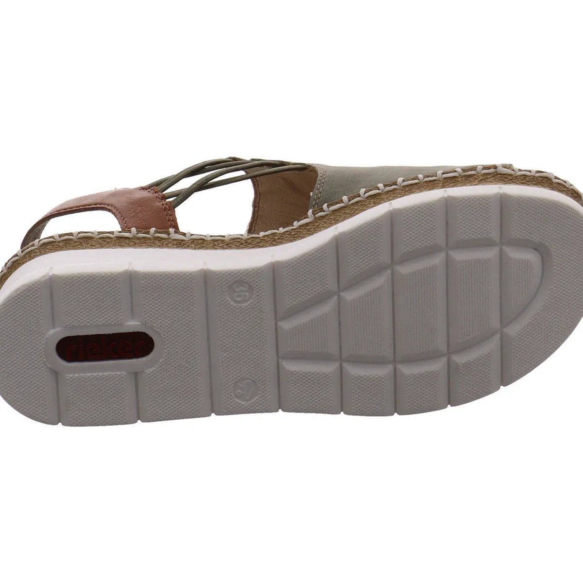 Gefertigt aus hochwertigem Kunstleder ist der vordere Riemen in Schilf Grün durch einen Gummizug mit dem hinteren Riemen in Braun an der Ferse verbunden. Der hintere Riemen lässt sich zwar nicht öffnen, jedoch ist durch den sehr flexiblen Gummizug ein leichter Einstieg und eine hervorragende, individuelle Passform gewährleistet. Ein tolles Detail ist die grobe Ziernaht in Weiß und die teilweise mit Bast umrandete grobe Laufsohle. Die Rieker Anti Stress Ausstattung sorgt den ganzen Tag für ein angenehmes Tragegefühl. Ein toller Schuh für die warmen Tage des Jahres.