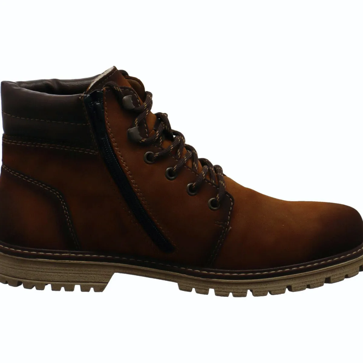 Der weich gepolsterte, farblich abgesetzte Schaft in dunklem Braun und das warme Innenfutter bieten Komfort, auch bei längerem Tragen und die profilierte Synthetiksohle gibt guten Grip.