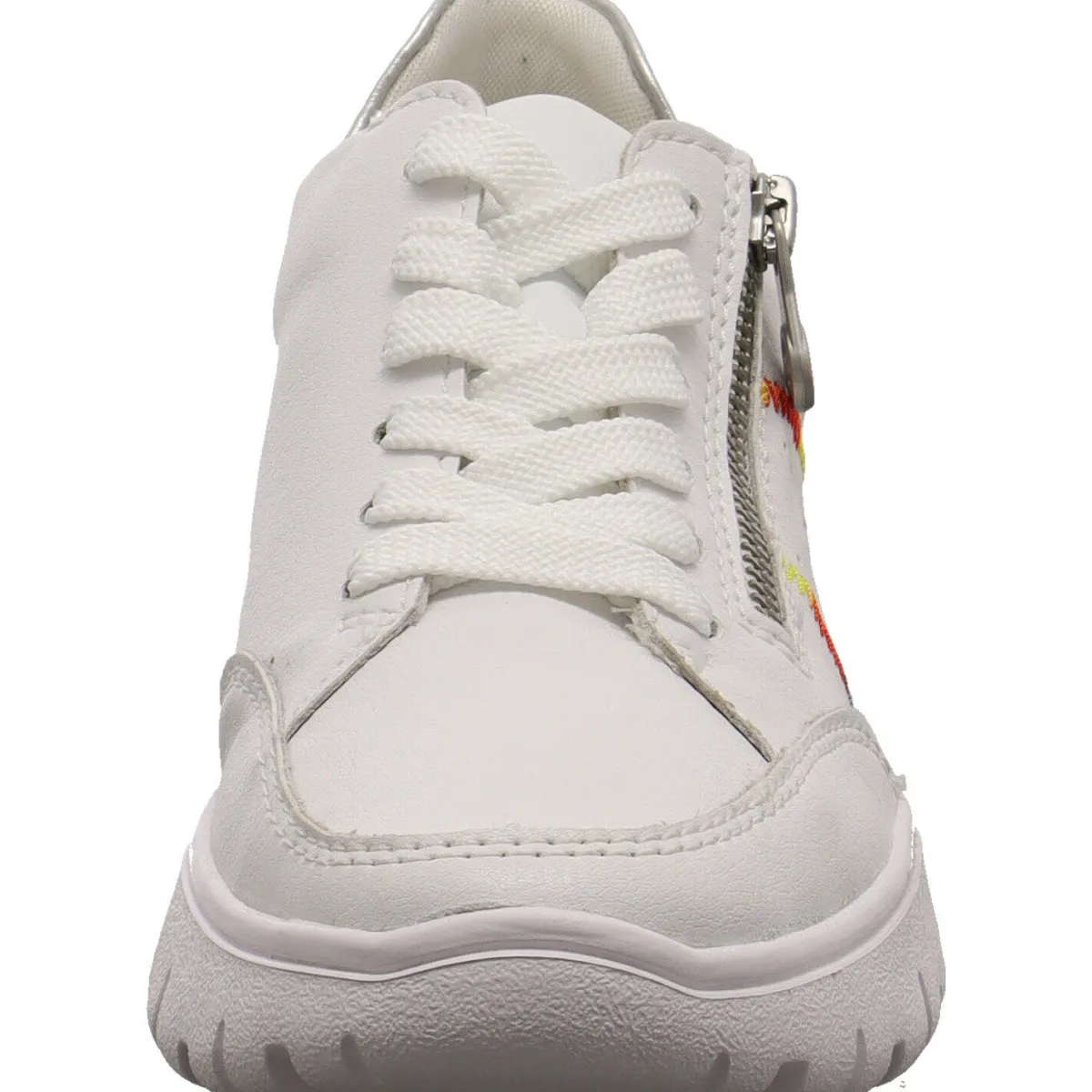 Das beschichtete Leder in Weiß ist an den Seiten mit einer bunten Ziernaht gearbeitet. Ein weiterer Hingucker ist der Einsatz an der Rückseite vom Schaft in Silber.
