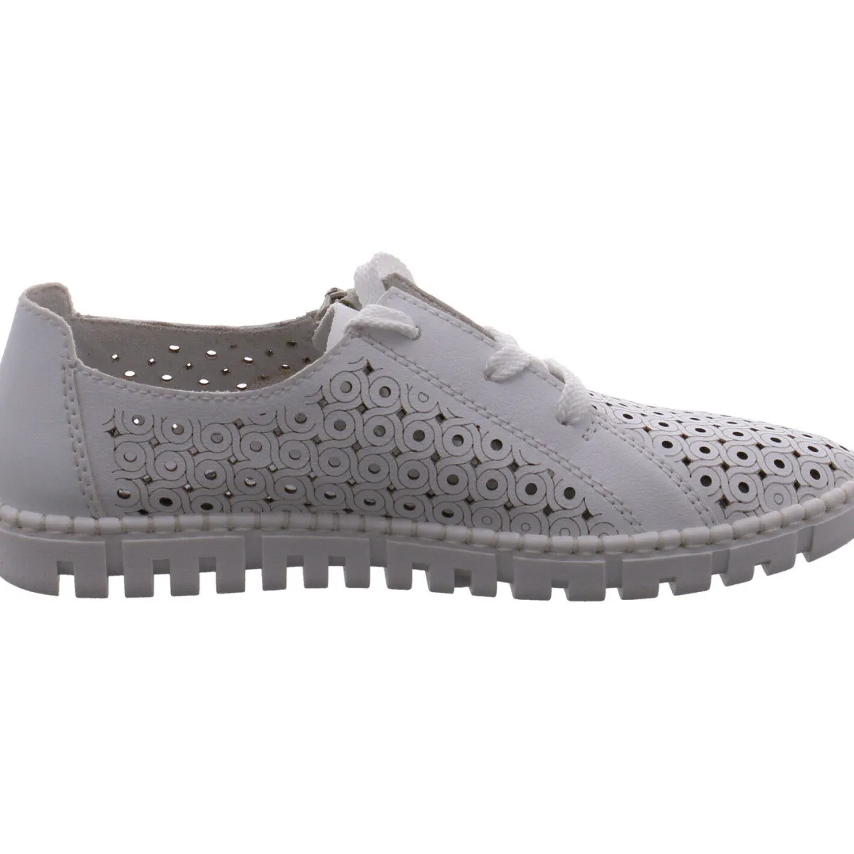 Gefertigt aus Echtleder in Weiß und mit einem Print versehen wurde der Schuh mit einer Allover Lochprägung ausgestattet, die zudem für ein angenehmes Fußklima sorgt.