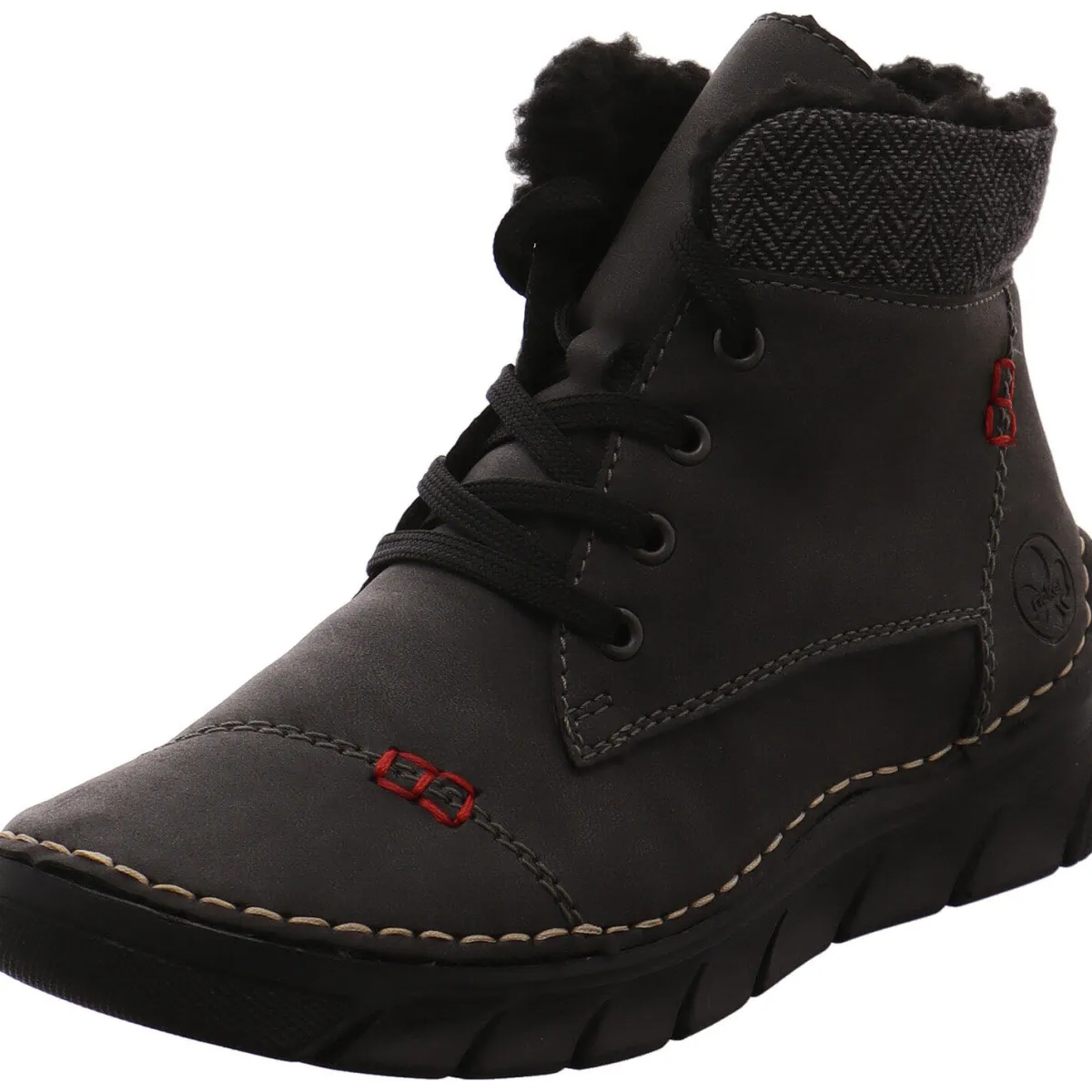 Gefertigt wurde der Schuh aus pflegeleichtem Kunstleder in Grau und ist mit Highlights und Ziernähten in Rot und Beige versehen. Der gemusterte Schaft und das typische Rieker Markenlogo an der Seite des Schuhs sind weiterer Hingucker.