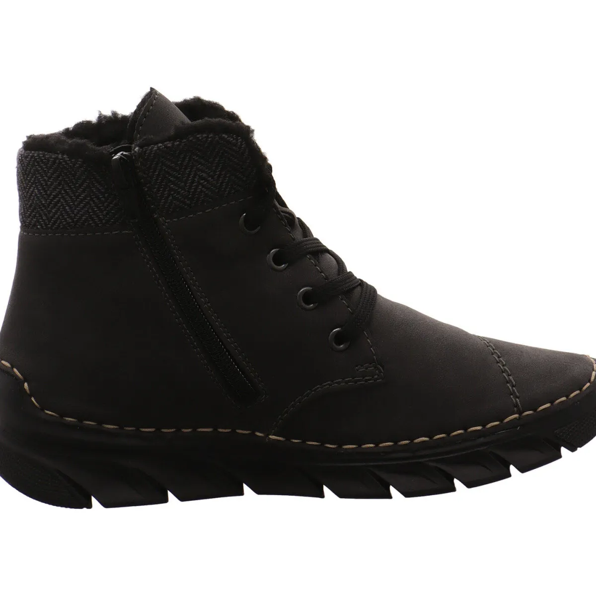 Der seitliche Reißverschluss erleichtert den Einstieg, während die gepolsterte Innensohle maximalen Tragekomfort verspricht. Durch die Schnürung kann der Schuh ausßerdem optimal an den Fuß angepasst werden.