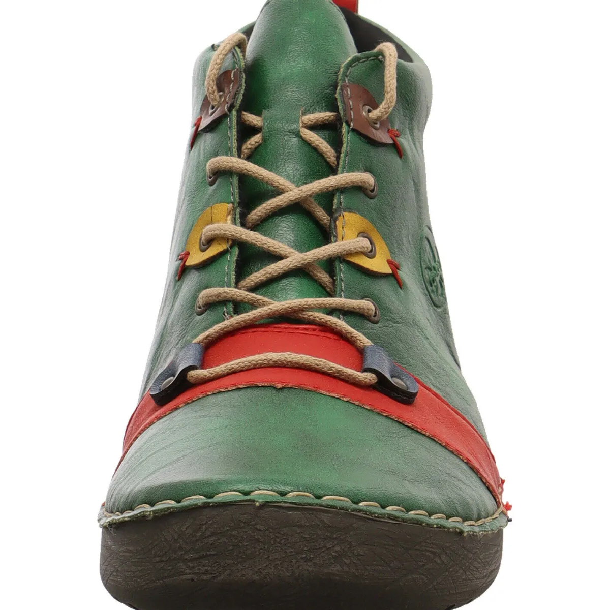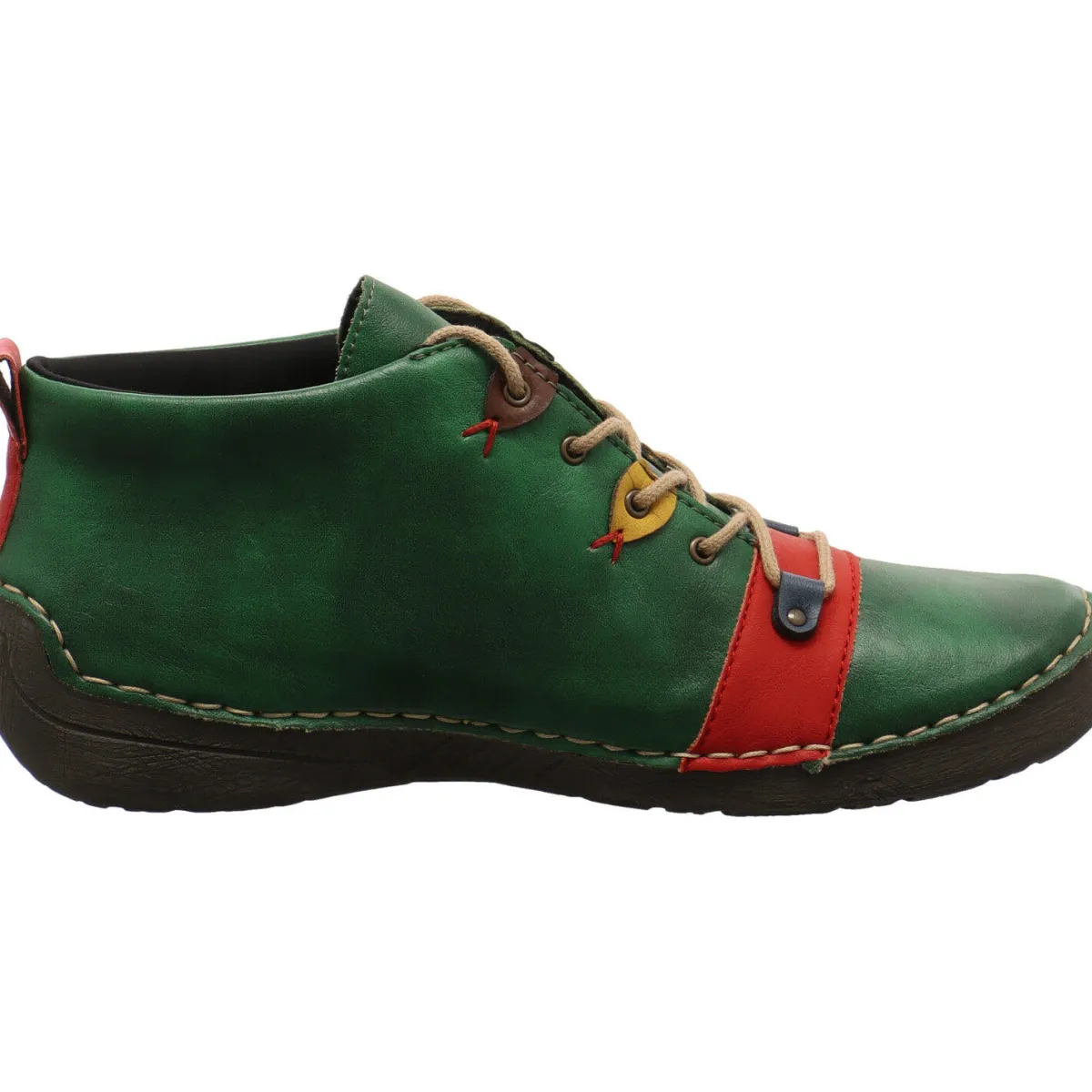 Gefertigt aus Kunstleder begeistert sie durch das Obermaterial in der Trendfarbe Grün und die Eyecatcher in Rot, Gelb, Blau und Braun.