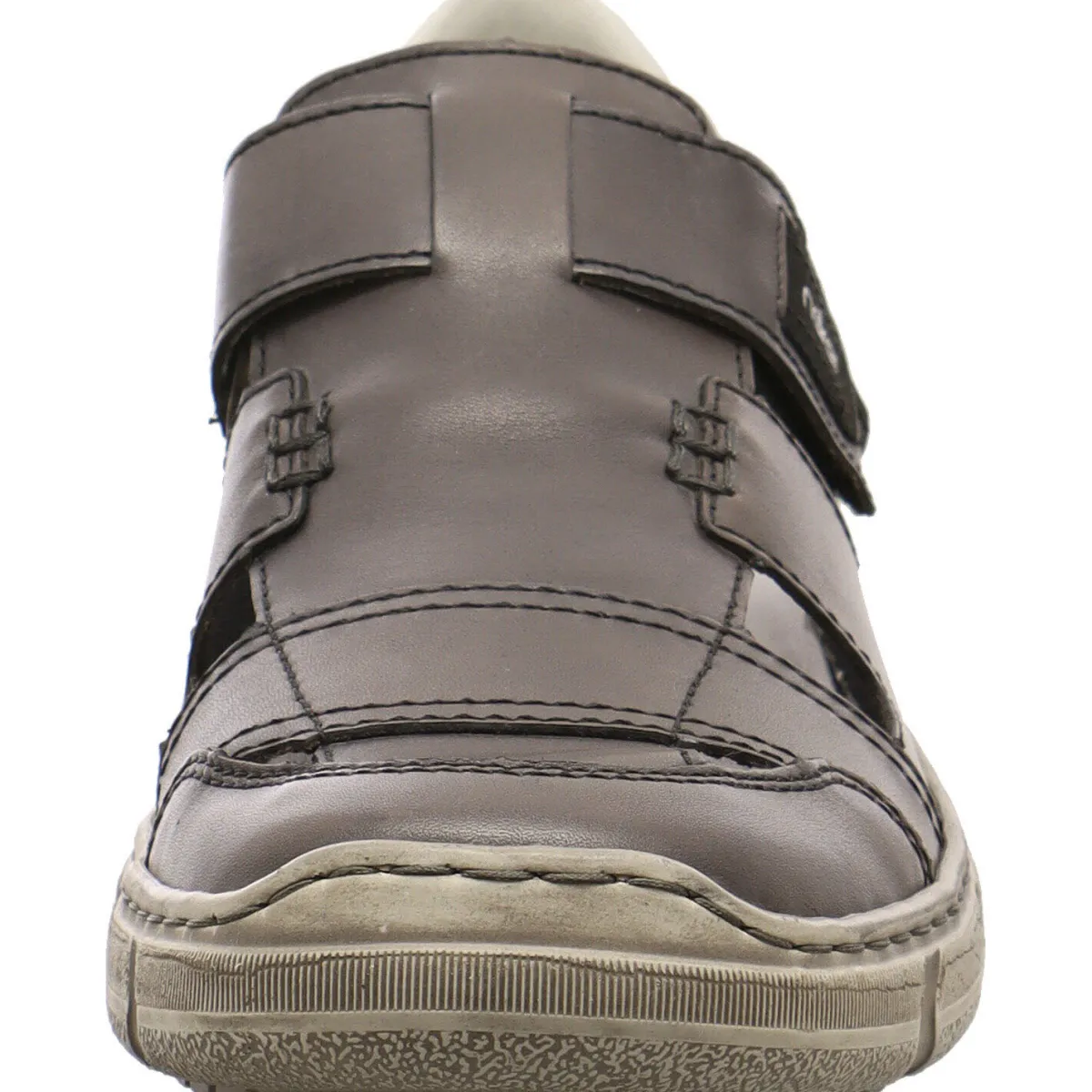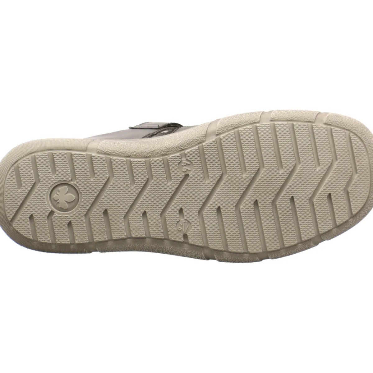 Der Schuh wurde aus hochwertigem Echtleder in dunklem Grau gefertigt und an der Seite mit verschiedenen Ziernähten versehen, die dem Look das gewisse Etwas verleiht. Der seitliche, verstellbare Riemen wird mit Klettverschluss geöffnet und geschlossen und ermöglicht einen komfortablen Einstieg und das die Rieker Anti Stress Echtleder Ausstattung macht den Schuh besonders bequem.