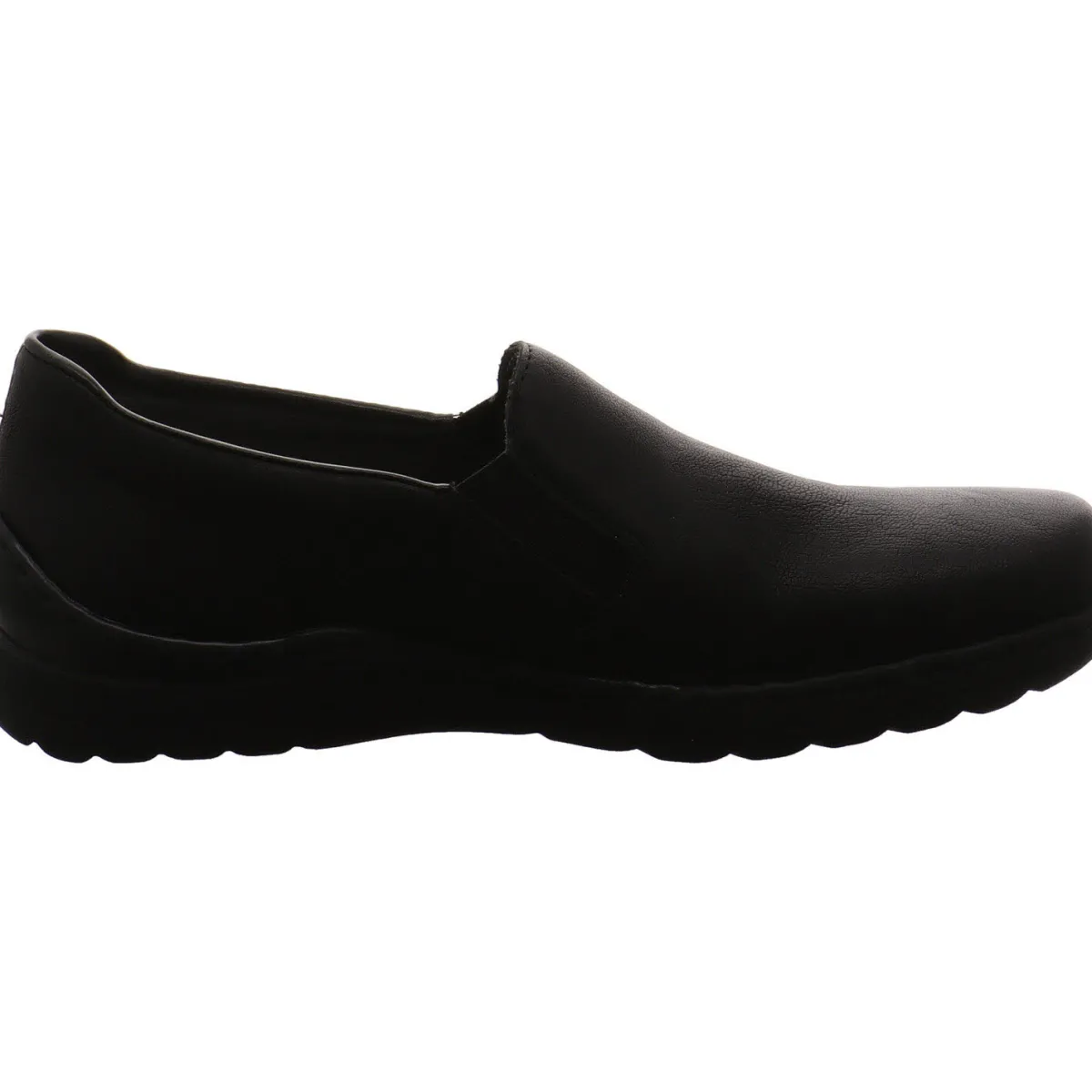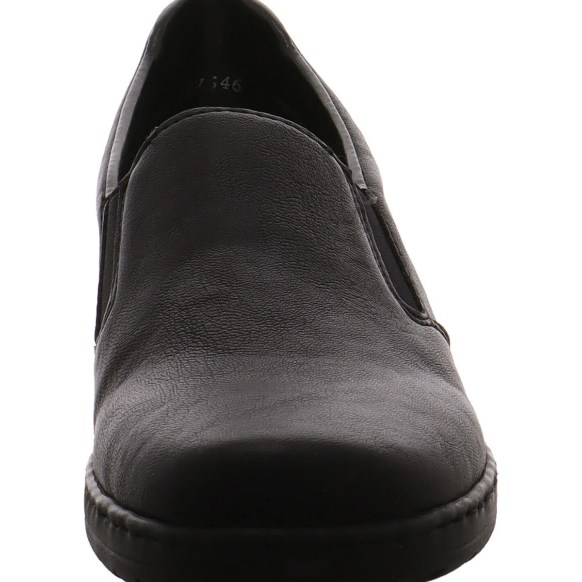 Das Obermaterial aus Kunstleder in Schwarz mit dem Rieker Markenzeichen an der Seite macht den Schuh schlicht und gut kombinierbar.