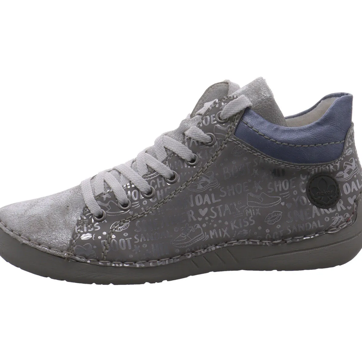 Das authentische Kunstleder in Hell Grau ist an den Seiten mit einem Print versehen, der Blicke auf sich zieht. Die Schnürung ist Weiß und fällt sofort ins Auge. Abgerundet wird das trendige Design durch die Details in Metallic Blau am Schaft und die Details in Silber Glitzer auf dem Blatt.