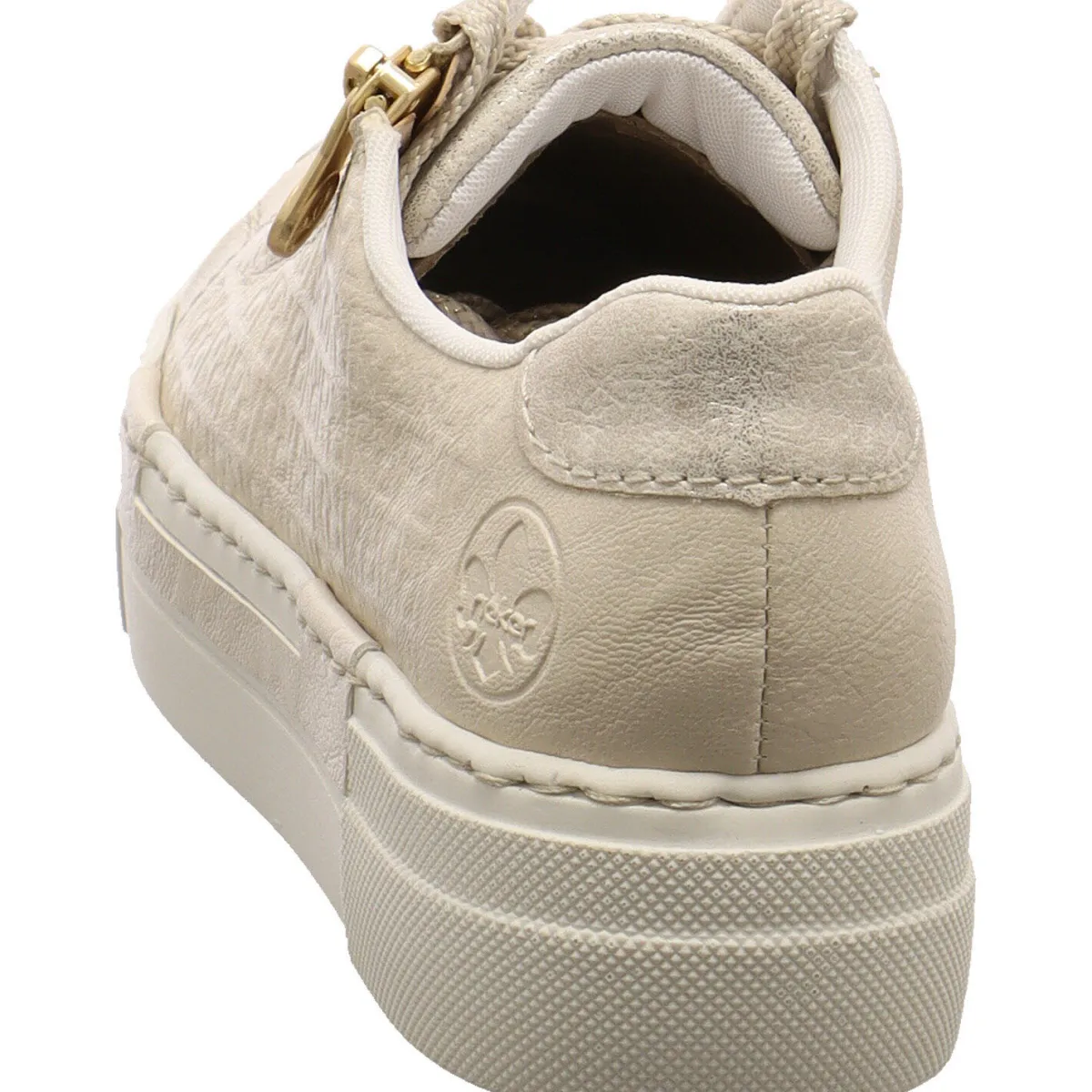 Das Obermaterial aus Kunstleder in Beige ist schlicht, aber dennoch durch die Plateausohle ein Hingucker. Er ist an der Seite mit einr tollen Prägung versehen und an der Ferse findest du einen Metallic Schimmer Einsatz. Durch die Schnürung mit Glizer Faden kann der Sneaker optimal an den Fuß angepasst werden und der seitliche Reißverschluss in Gold, hilft bei einem leichten Einstieg. Auch hier findest du die tolle Antistress Innensohle, die besonders weich und komfortabel ist. Die Gummilaufsohle ist zudem rutschhemmend und bietet einen tollen Laufkomfort.