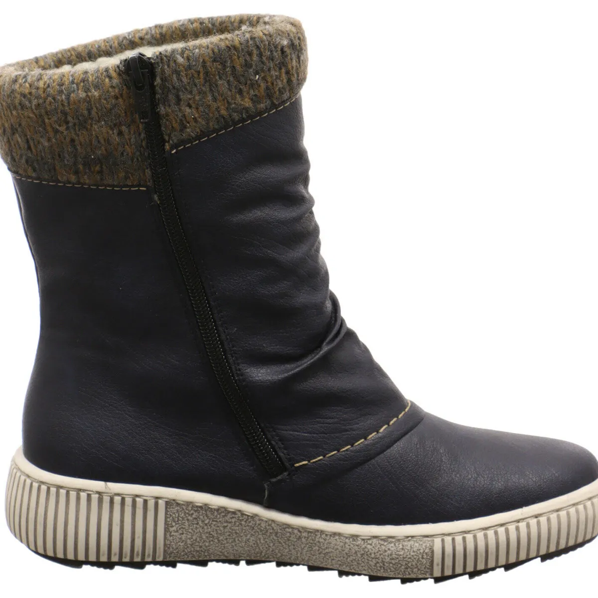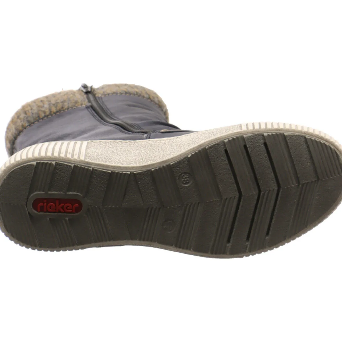 Gefertigt aus einem Mix aus Kunstleder und Textil in Blau, ist der Schaft mit Wolle im Strick Look versehen. Das umgeknickte Obermatrial am Schaft, in Rot gestaltet, sowie das zusammengeraffte Obermaterial und die farblichen Ziernähte sind zusätzliche Eyecatcher.