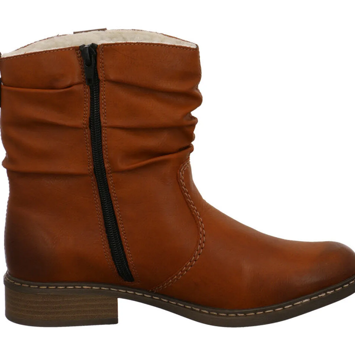 Das Obermaterial aus Kunstleder in Cognac Braun ist mit hellen Ziernähten versehen und am Schaft in Falten gelegt, was dem Schuh einen coolen Look verleiht.