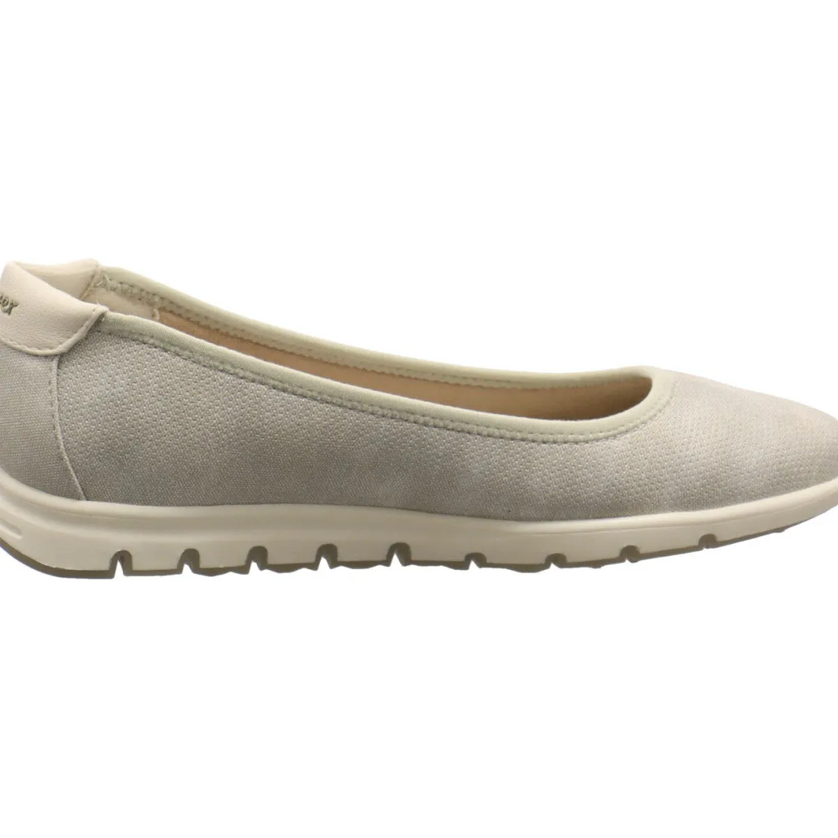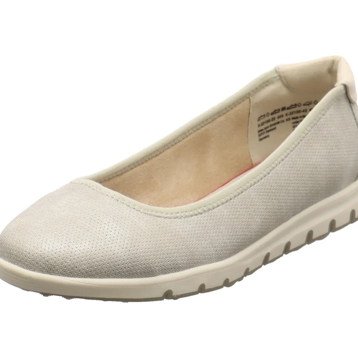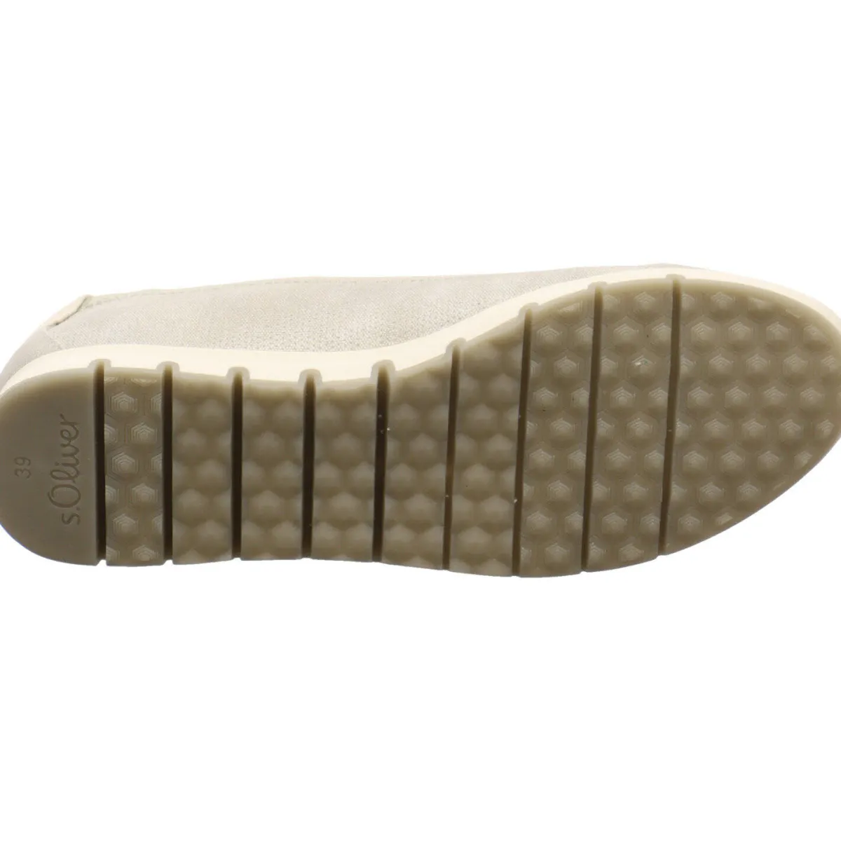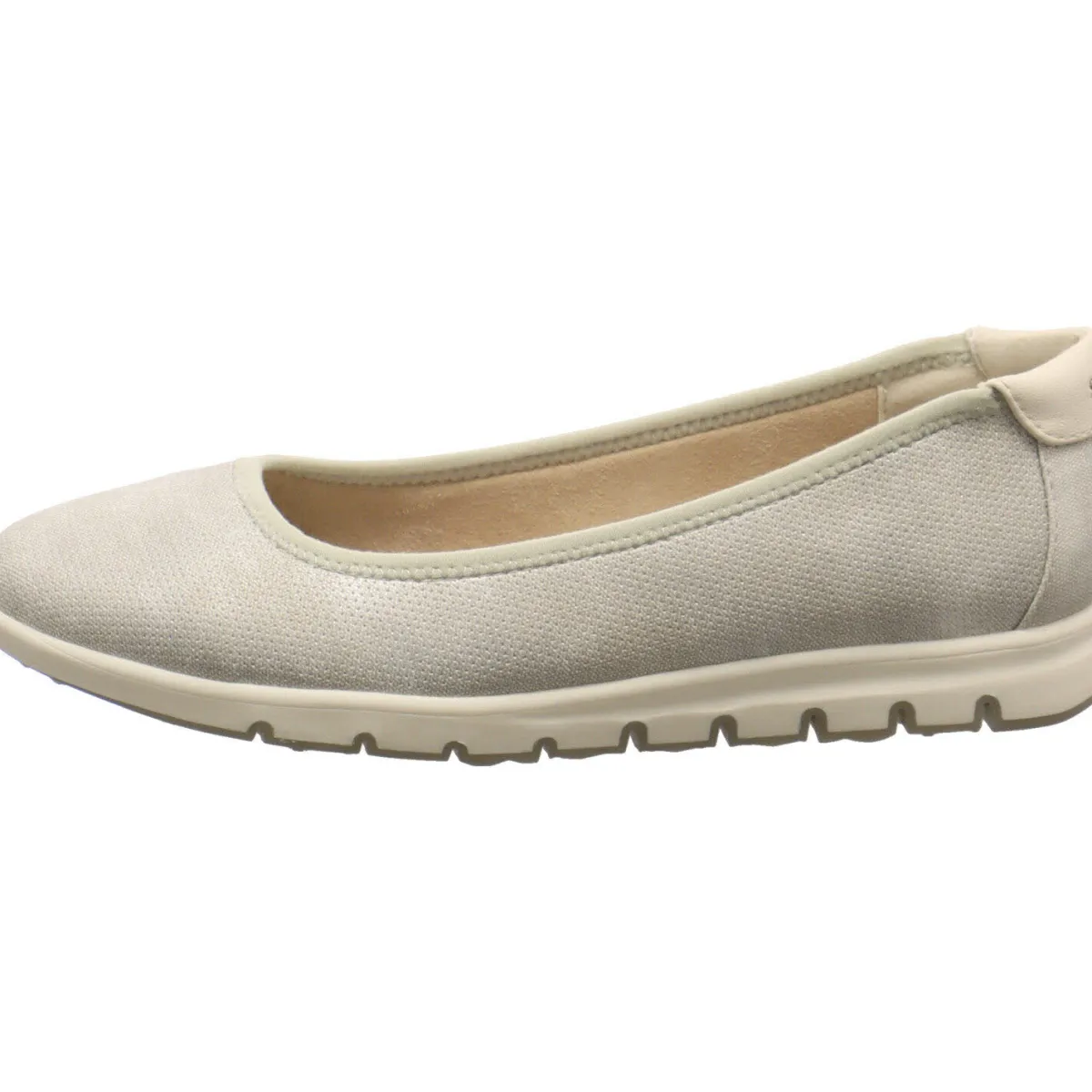 Pflegeleichtes Obermaterial aus Kunstleder in Champagne Grau ist mit einer individuellen Prägung versehen und an der Ferse angenehm gepolstert.