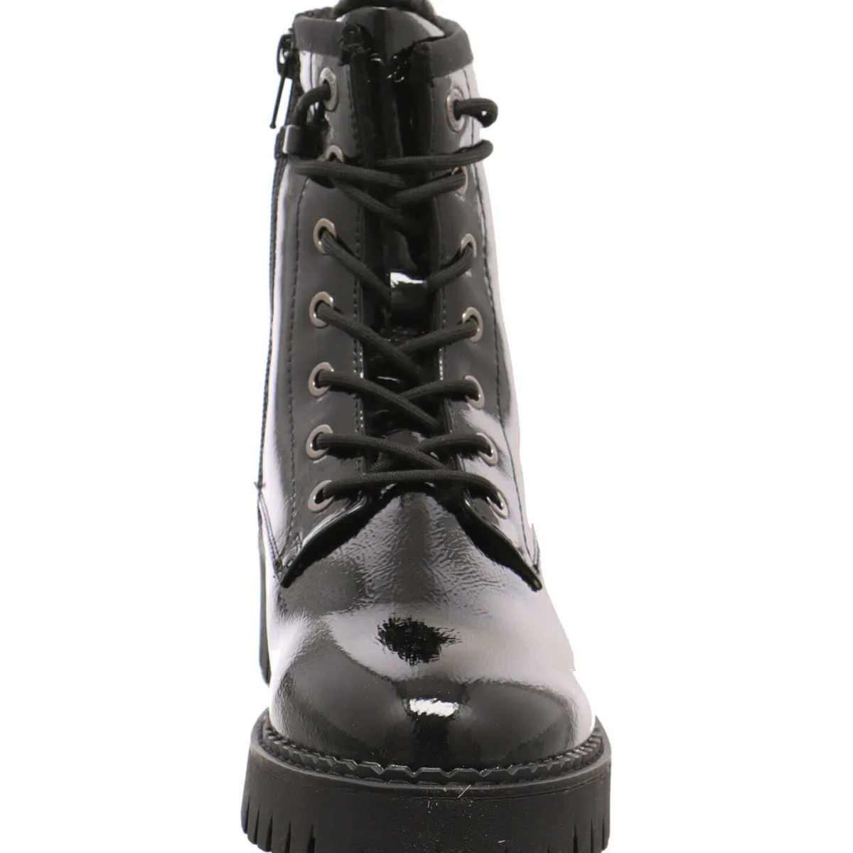 Das Obermaterial aus Kunstleder in Schwarz Lack ist am Schaft mit der Markenaufschrift versehen, die als Hingucker dient.