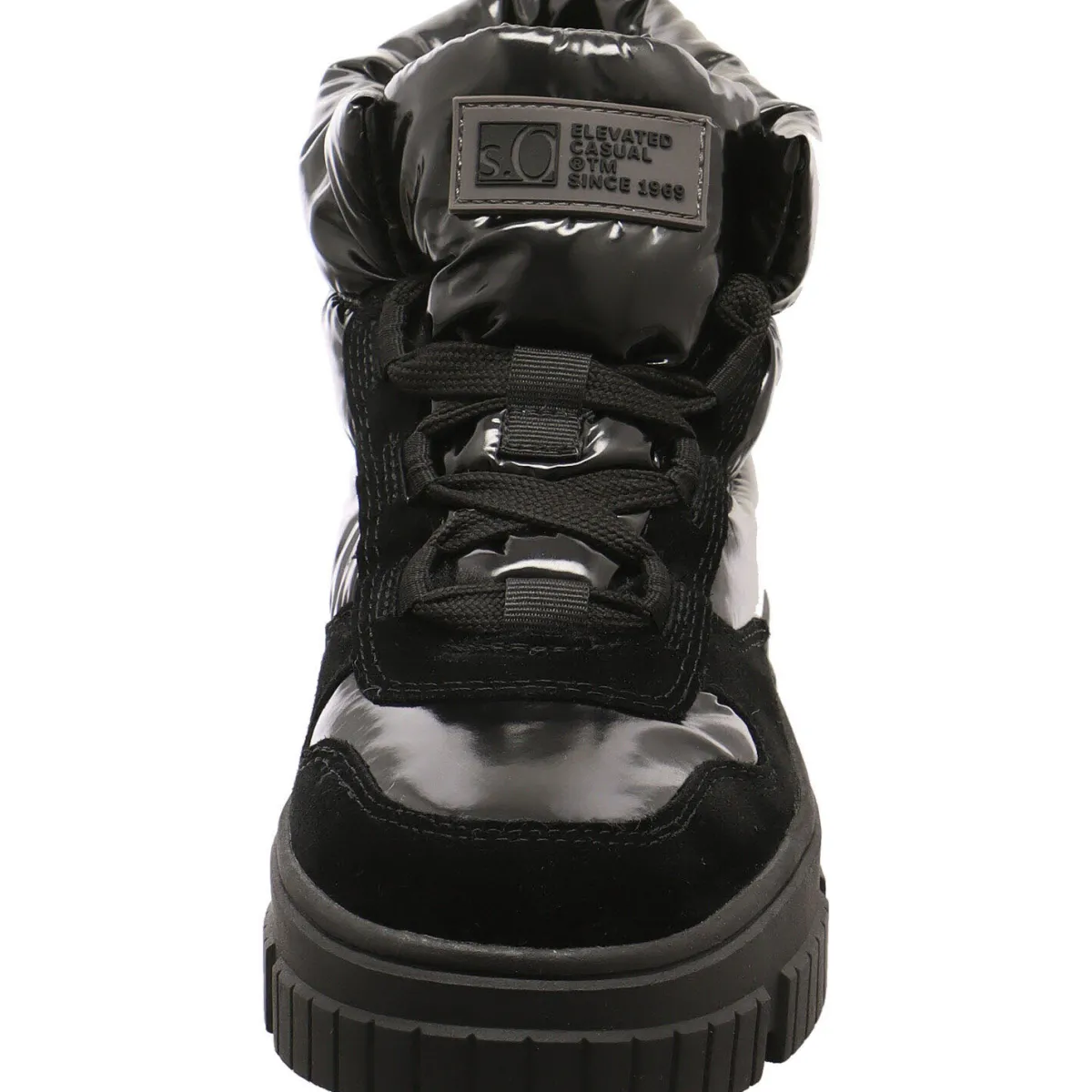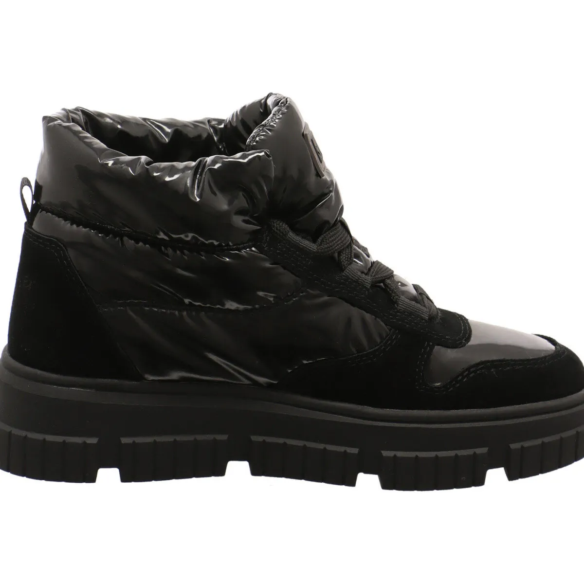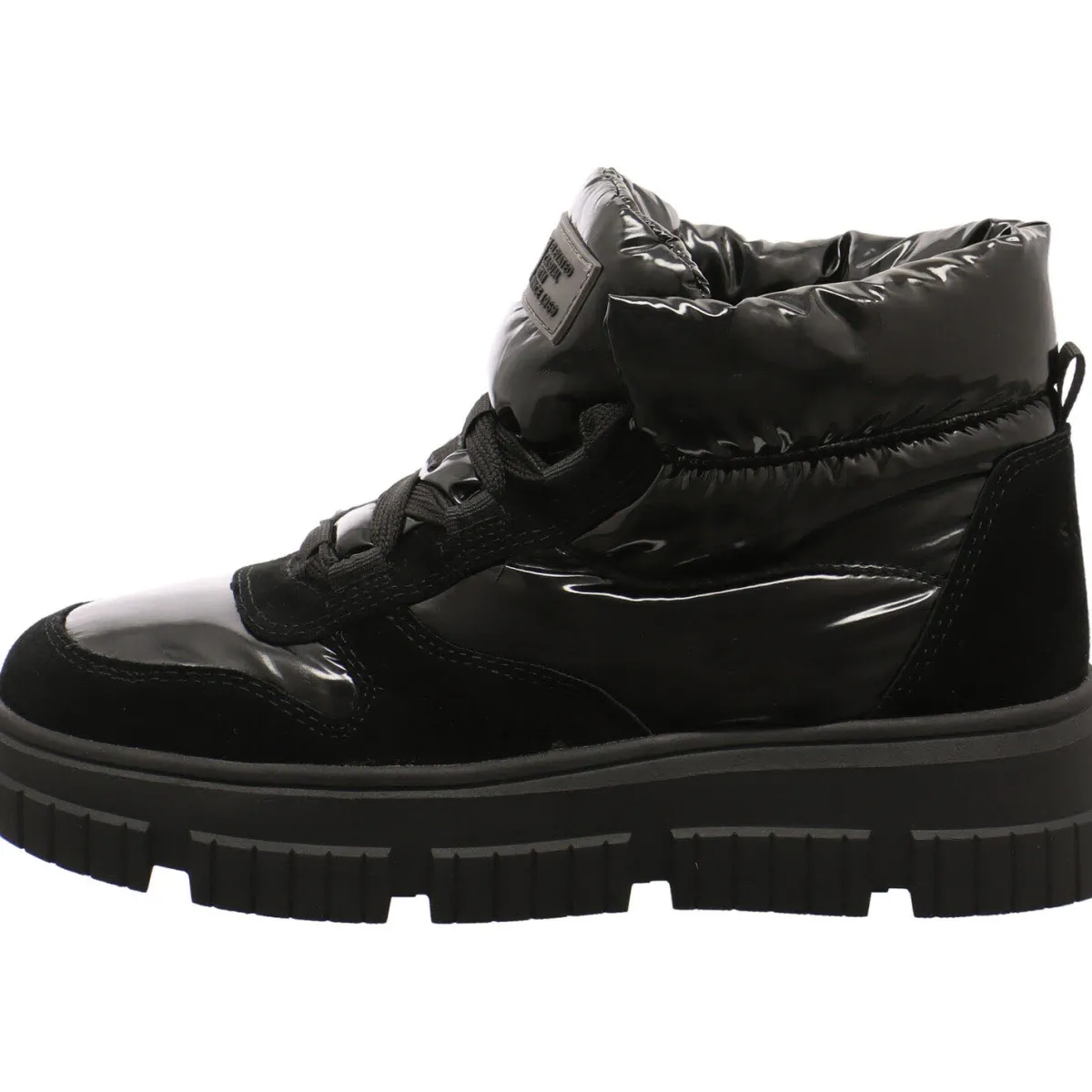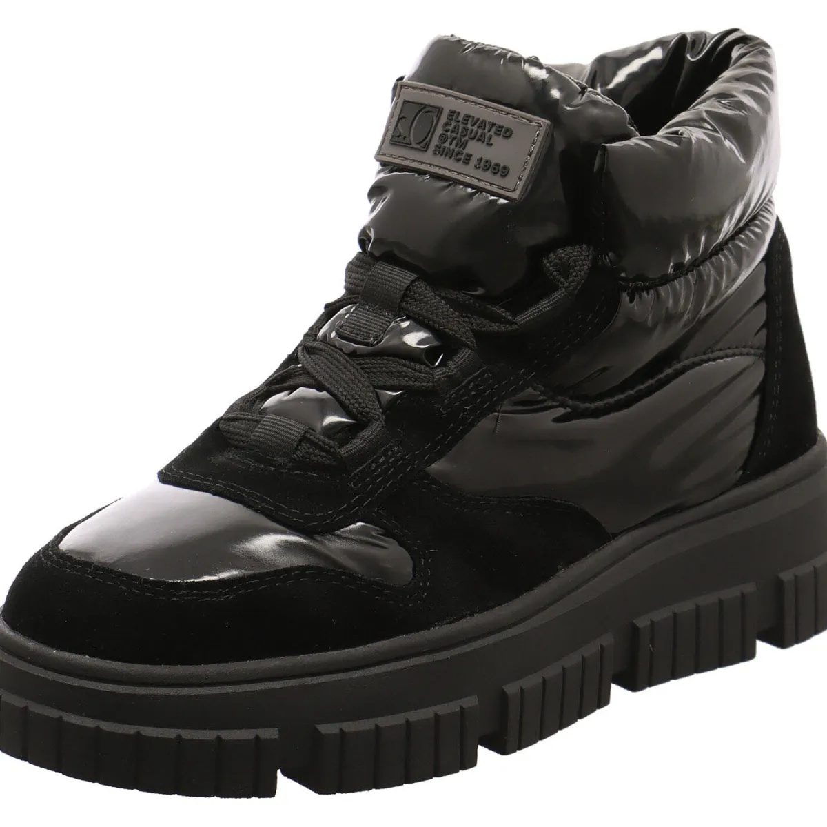Direkt ins Auge fällt dabei das Obermaterial, aus einem gekonnten Mix aus Echtleder und Textil in Schwarz Lackoptik.