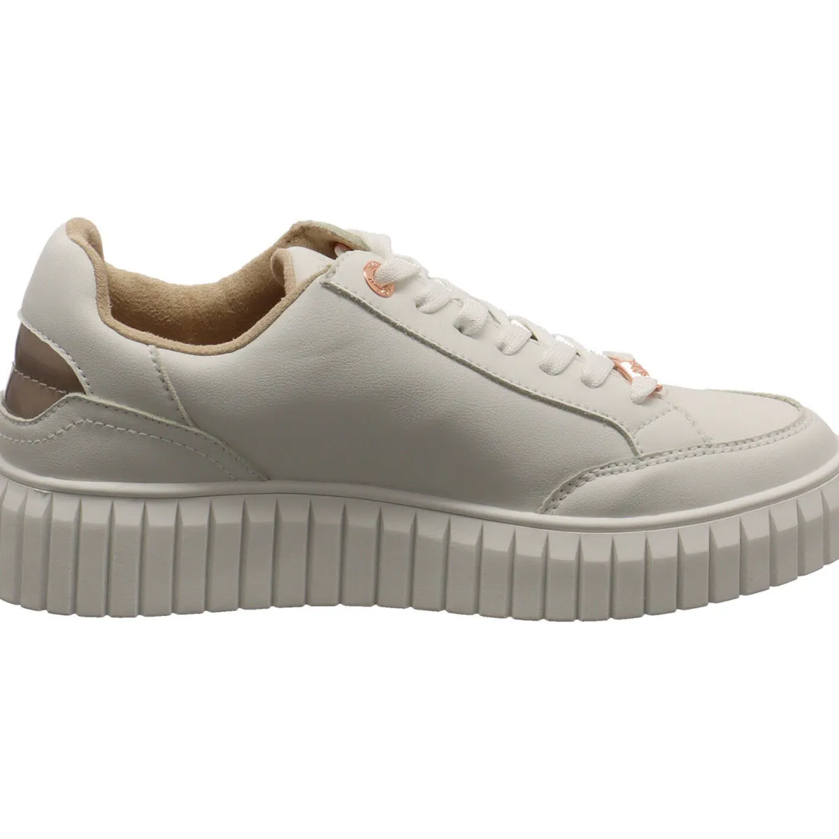 Er wurde aus Kunstleder in Weiß gefertigt. Das Marken Logo an der Seite und ein Einsatz an der Ferse in Rose Gold, verleien ihm den modischen Touch. Der Schaft ist angenehm weich gepolstert und mit der Schnürung kannst du ihn genau auf deine Bedürfnisse anpassen. Auch an den Ösen findest du das Rosegold wieder.