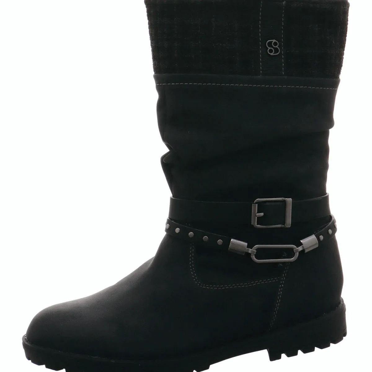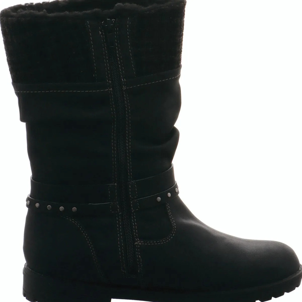 Gefertigt aus einem gekonnten Mix aus Kunstleder und Textil in Schwarz begeistert er durch den Strickbund am Schaft Schaft und den Plüsch Rand. Zierriemen um den Knöchel sind zusätzöiche Eyecatcher.