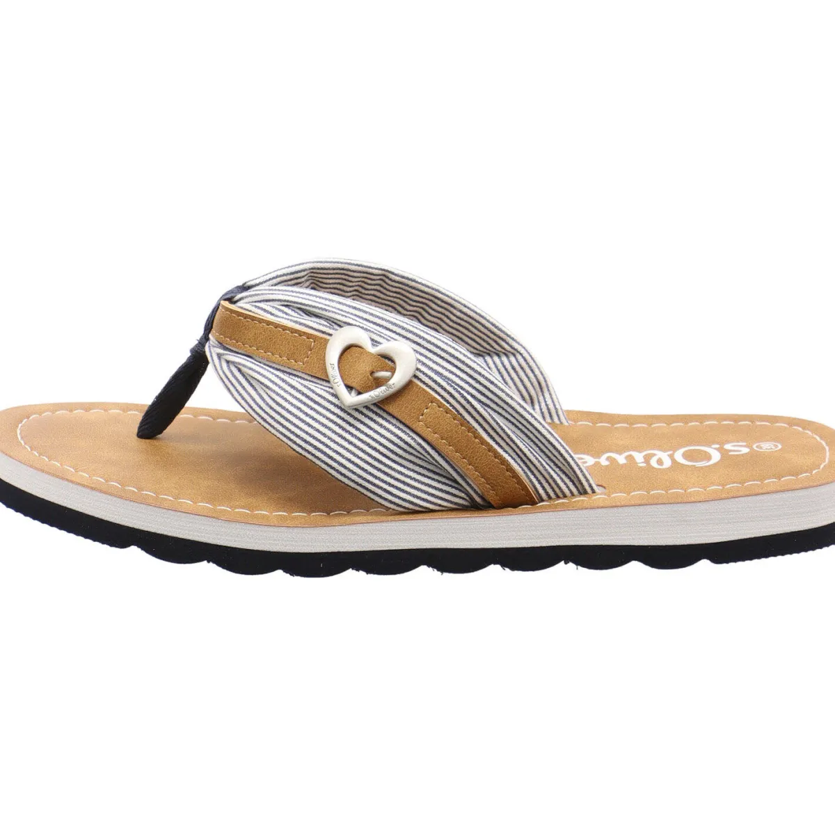 Das Obermaterial aus einem originellen Mix aus einem schmalen Kunstlederbändchen in Braun und einem breiten Textilband in einem Süßen Streifen Muster in weiß und Blau macht diesen Zehentrenner einzigartig und zugleich absolut bequem.