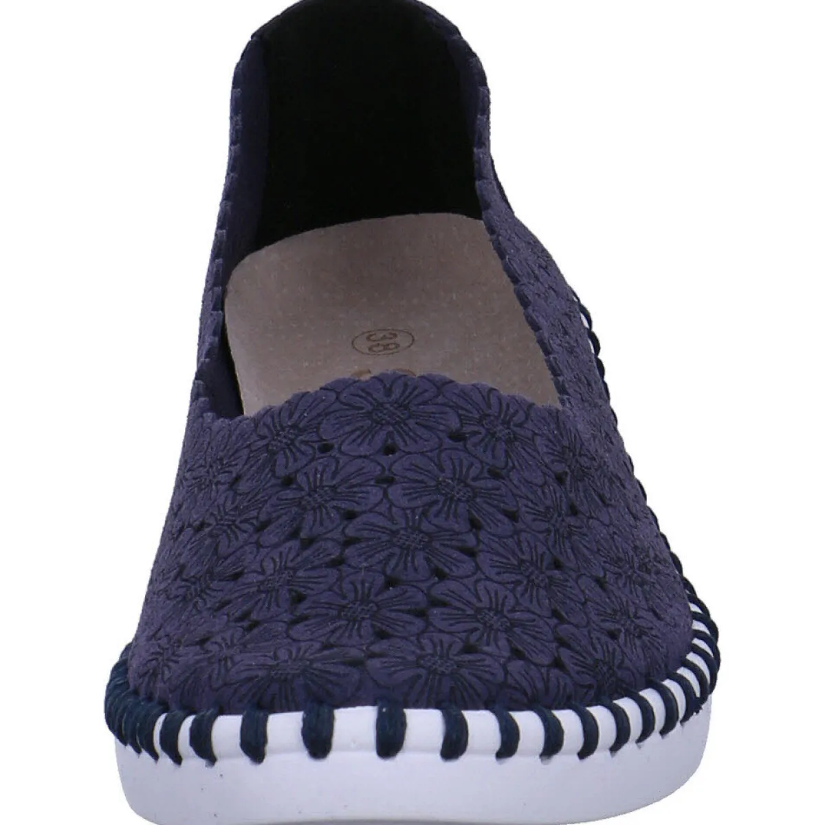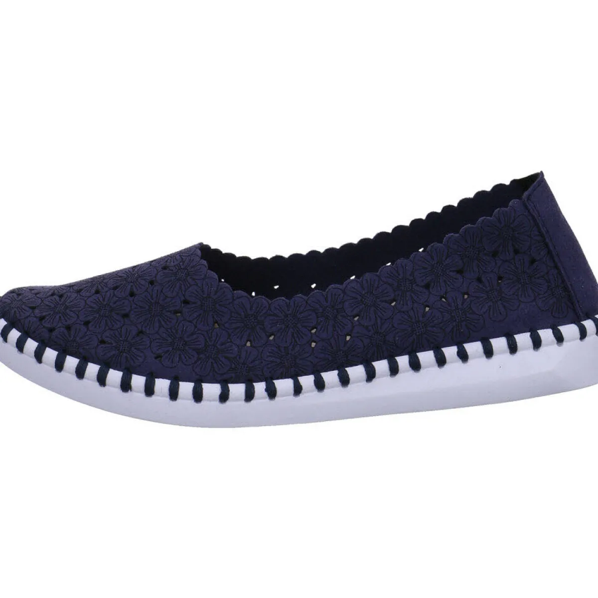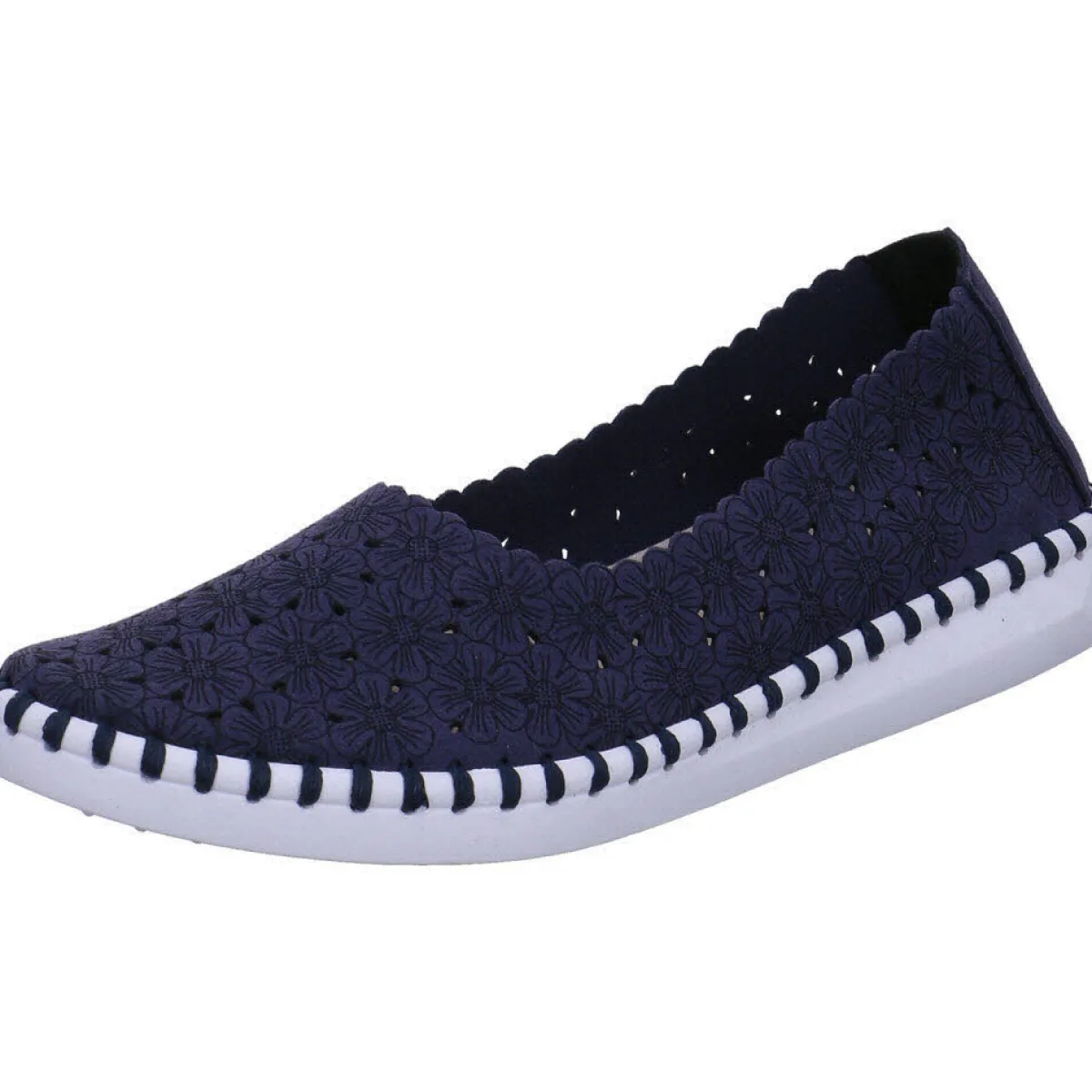Er wurde aus Kunstleder in Navy Blau gefertigt und mit stylischen Cutouts, einem Blumen Print und einer schicken Ziernaht um die Laufsohle versehen.
