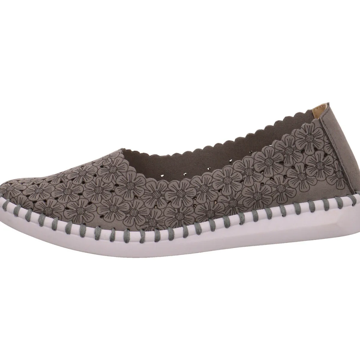 Er wurde aus Kunstleder in Grau gefertigt und mit stylischen Cutouts, einem Blumenmuster und einer schicken Ziernaht um die Laufsohle versehen.