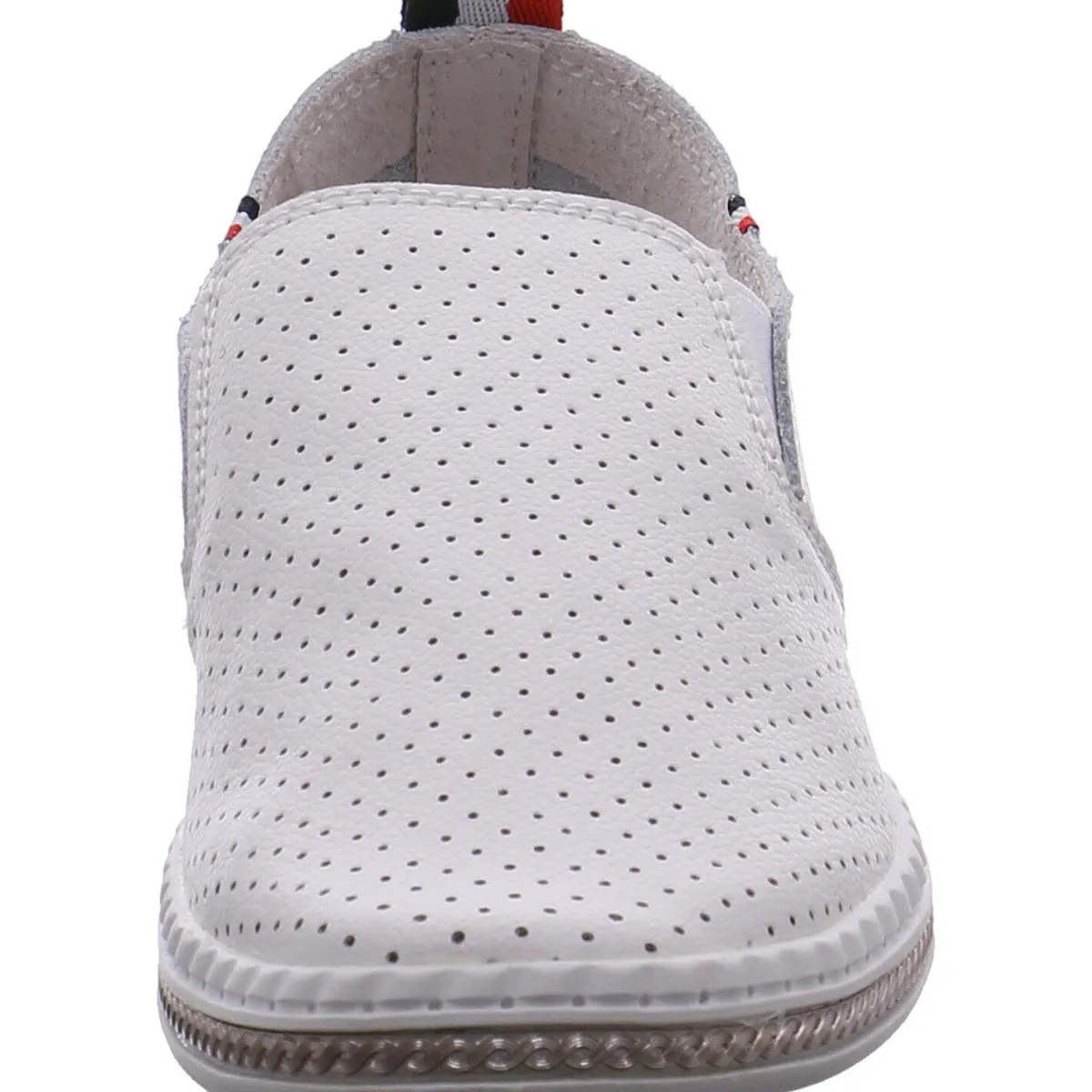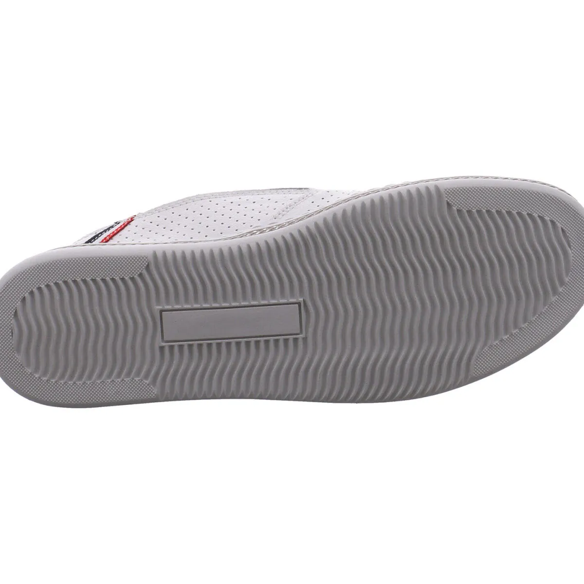Der Schuh ist mit kleinen Lasercuts und Streifen in Rot, Weiß und Blau verziehrt. Ein besonderes Highlight ist der metallische Schmuckstreifen um die Laufsohle herum.