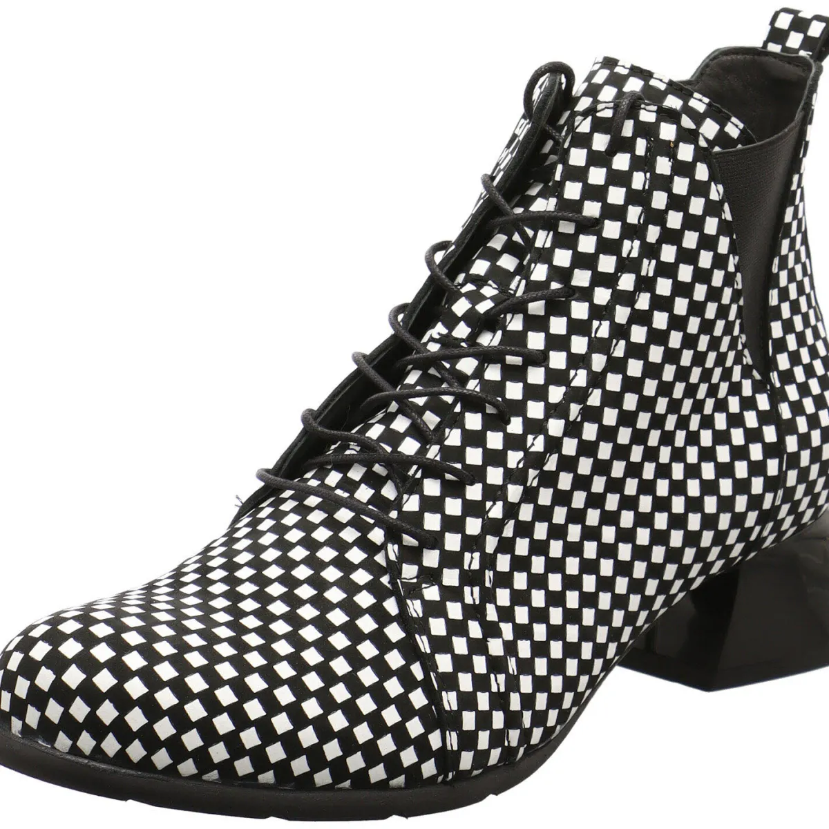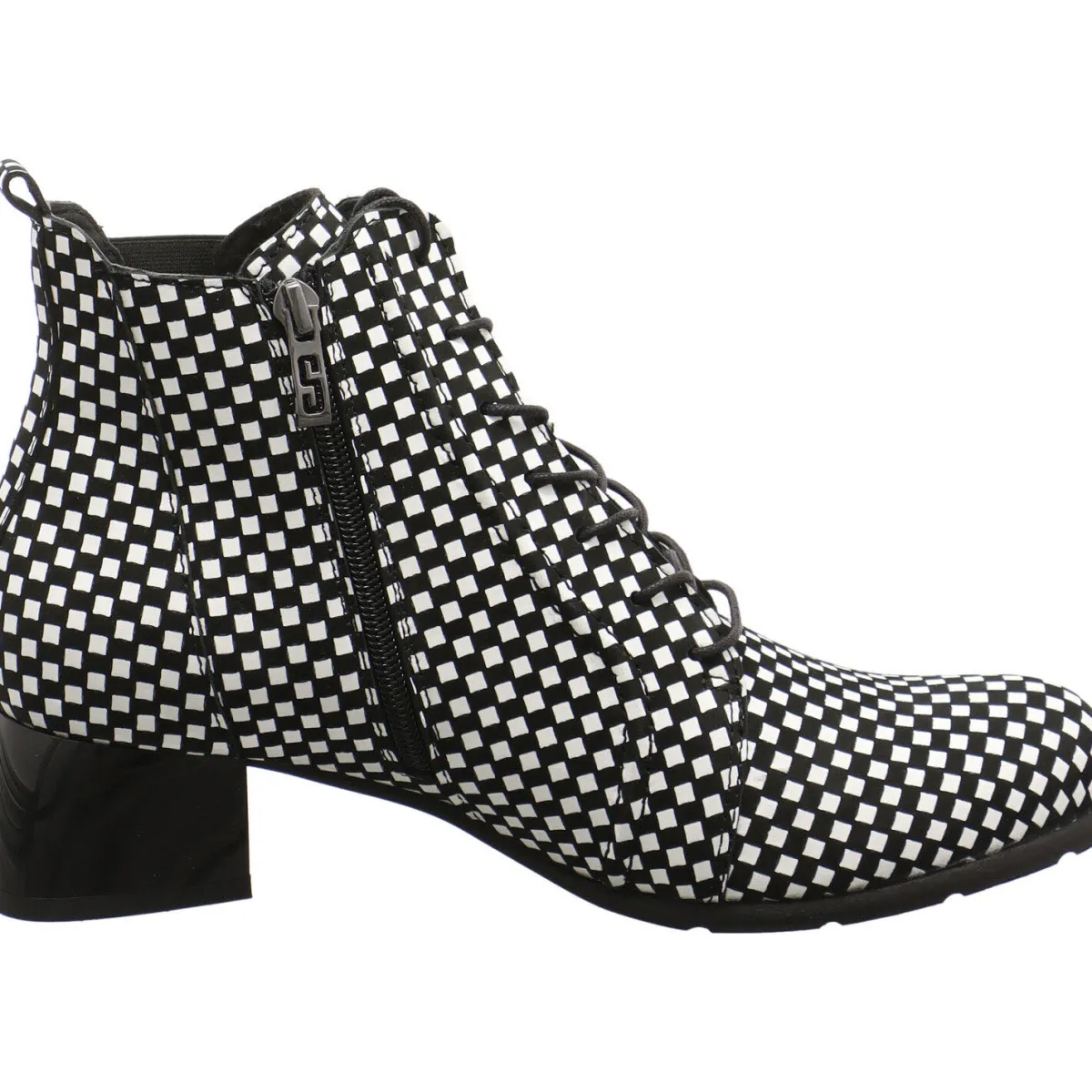 Das Obermaterial aus Echtleder presentiert sich im Karo Design in Schwarz, Weiß.