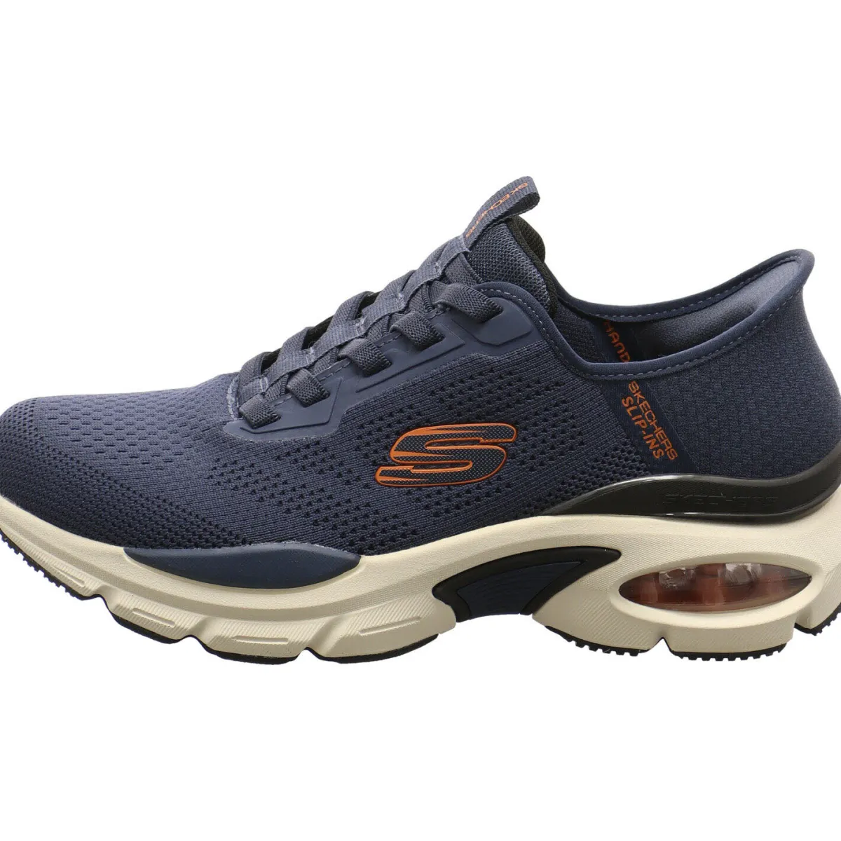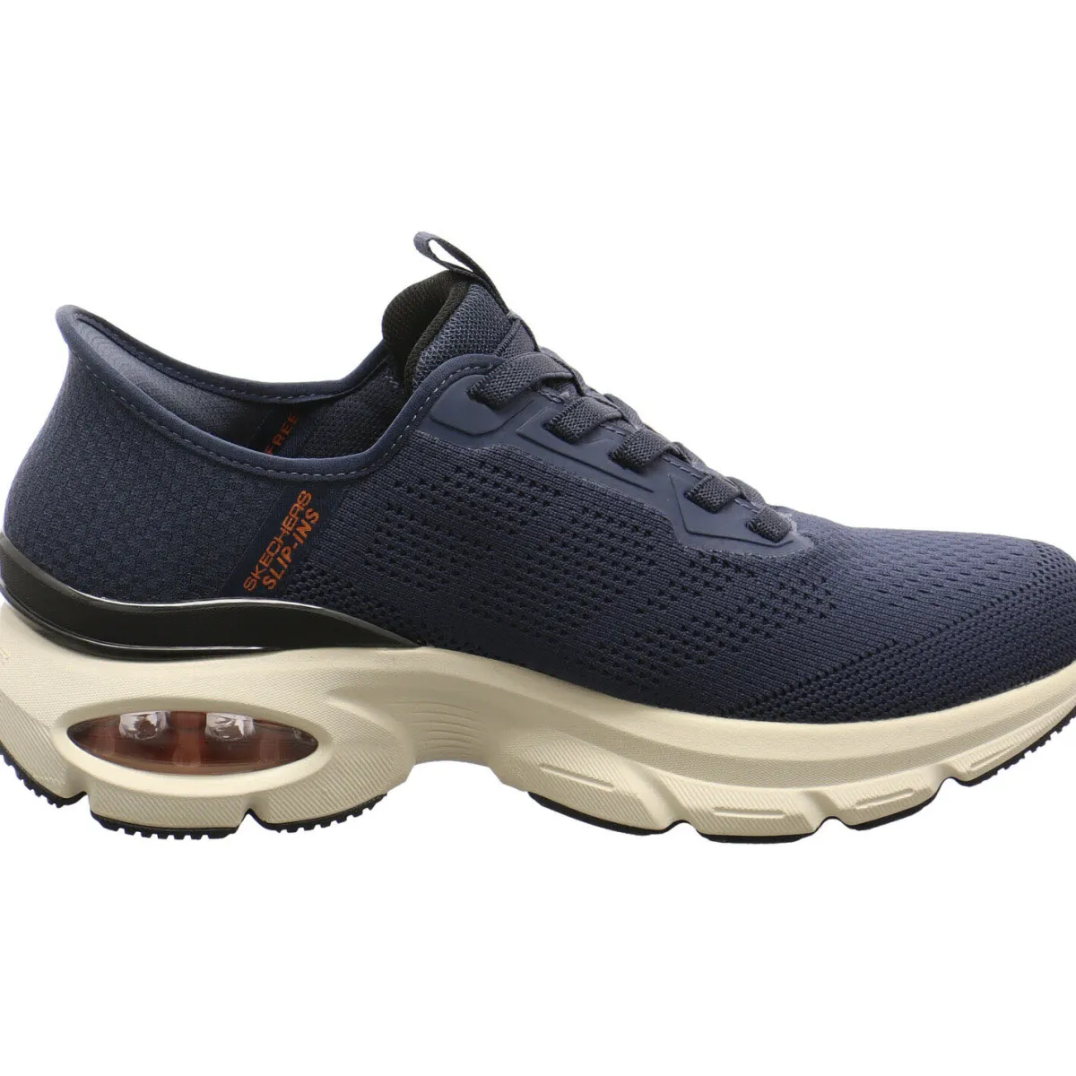 Das Obermaterial aus Textil Funktionsmesh, in Blau ist besonders flexibel. Synthetische Einsätze stabilisieren den Schuh. Die Air-Cooled Memory Foam Innensohle sorgt für maximalen Komfort. Dieses Modell ist zusätzlich mit der Luftgepolsterten Skech-Air-Zwischensohle ausgestattet. Diese sorgt für optimale Dämpfung bei jedem Schritt.