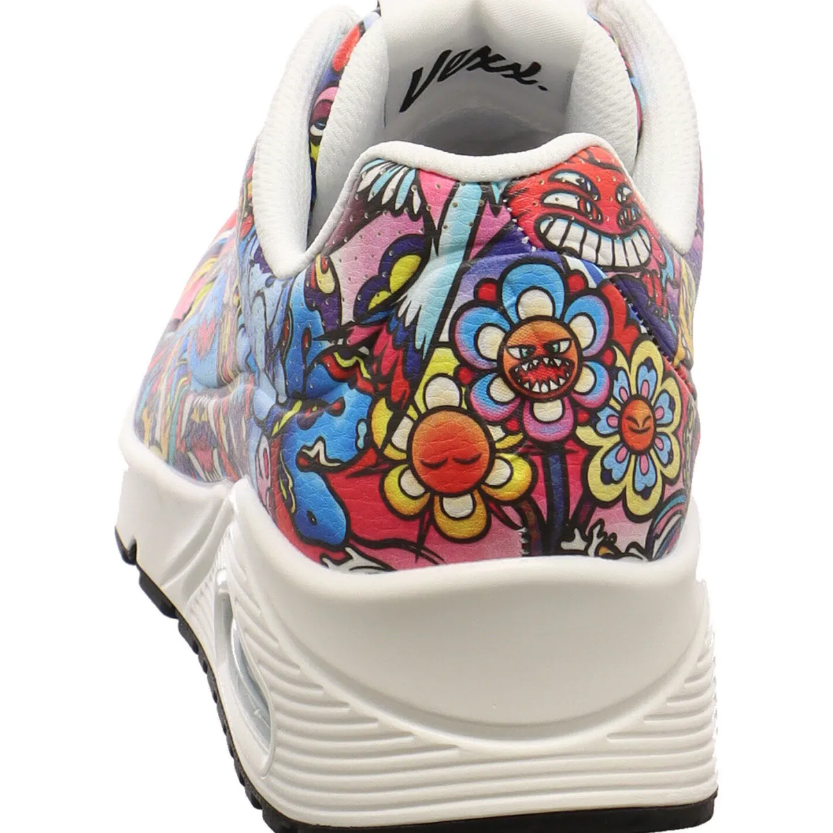 Der Sneaker verfügt über ein Obermaterial aus synthetischem Durabuck mit den charakteristischen „Doodles“ von Vexx, eine Skechers Air-Cooled Memory Foam Einlegesohle und eine sichtbare luftgepolsterte Skech-Air Zwischensohle. Der Schaft ist angenehm gepolstert und durch die Schnürung kann der Schuh perfekt an den Fuß angepasst werden.