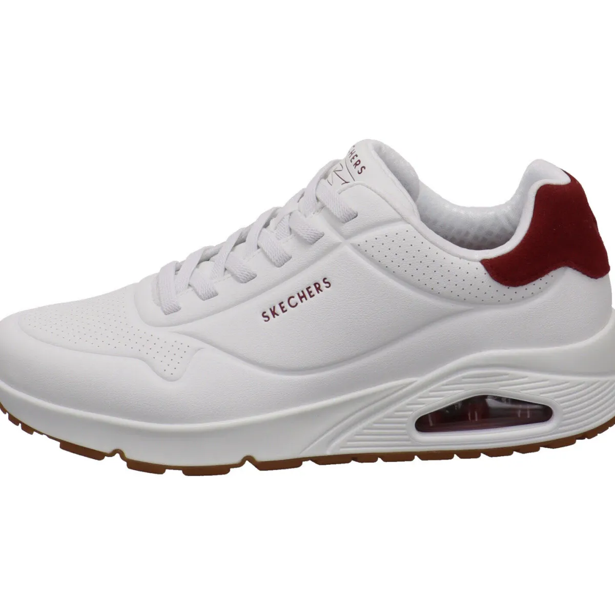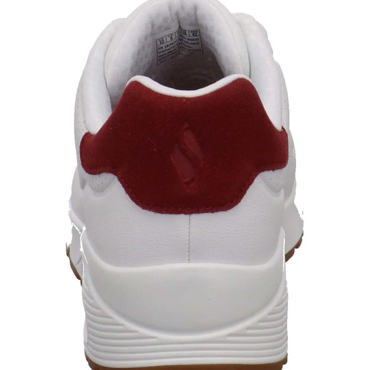 So ist das Obermaterial aus Kunstleder in Weiß an der Ferse mit einem Einsatz in Nubukleder Optik Burgundy Rot verziert. Kleine Lasercuts auf dem Obermaterial und ein Muster des Innenfutter, geben dem Schuh seinen besonderen Look.