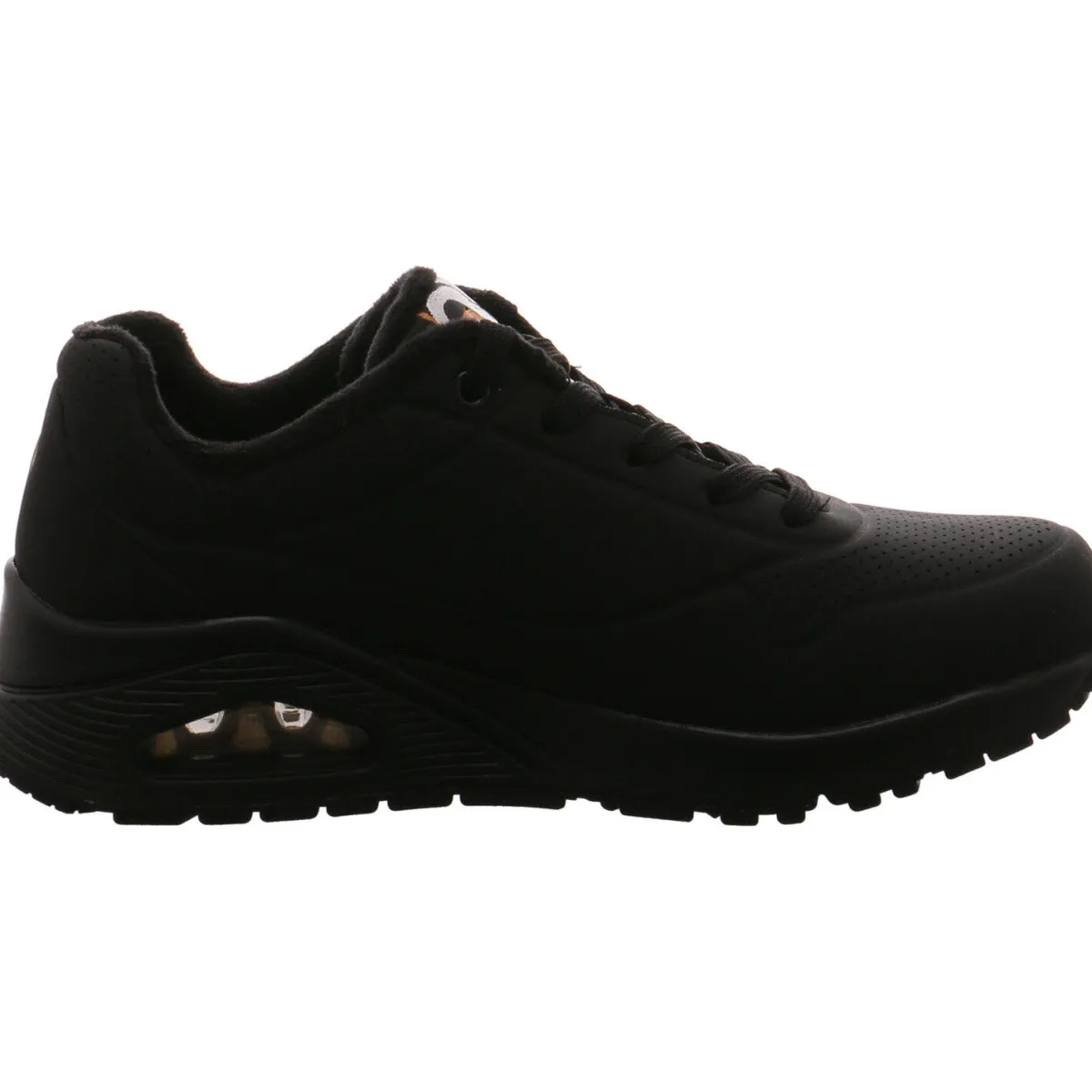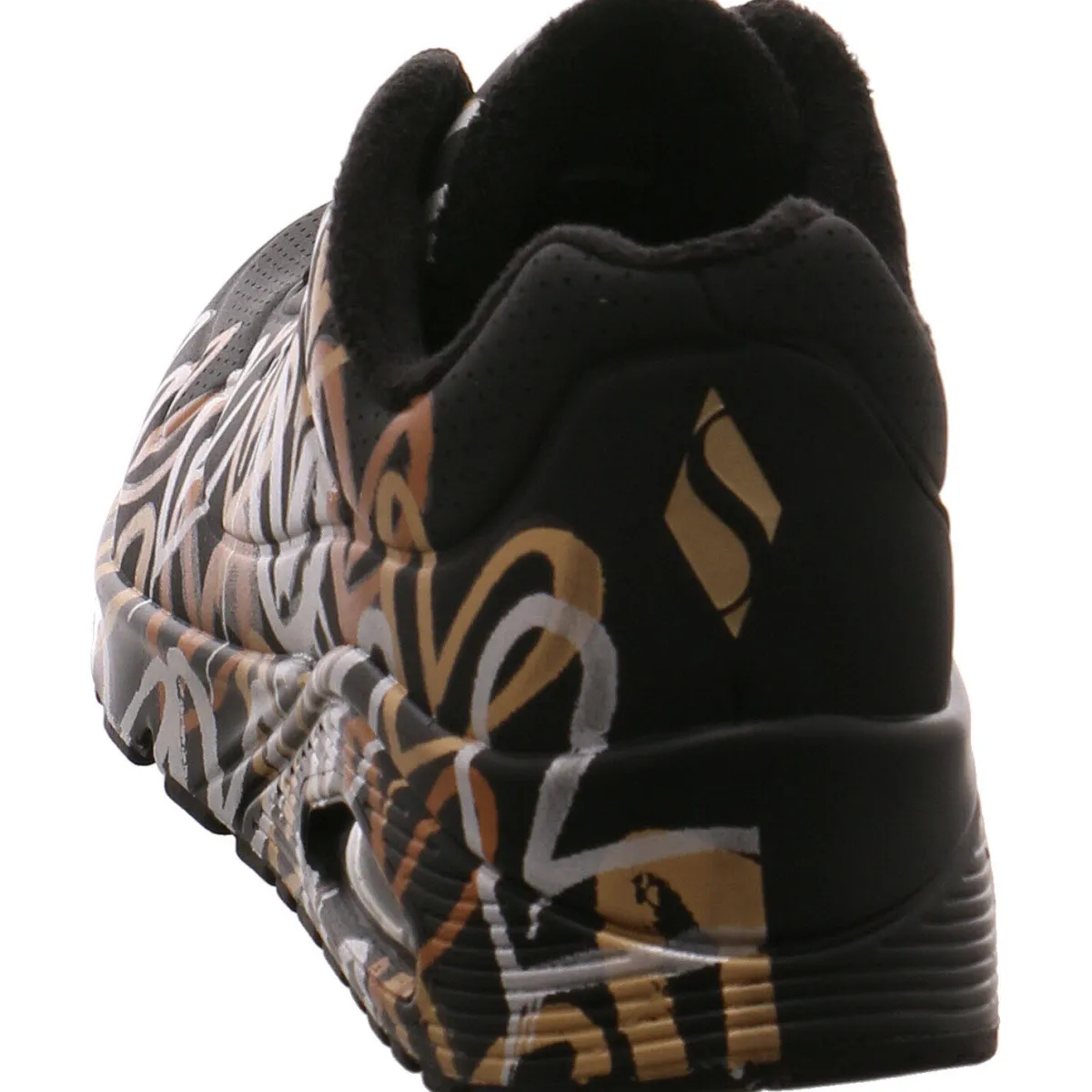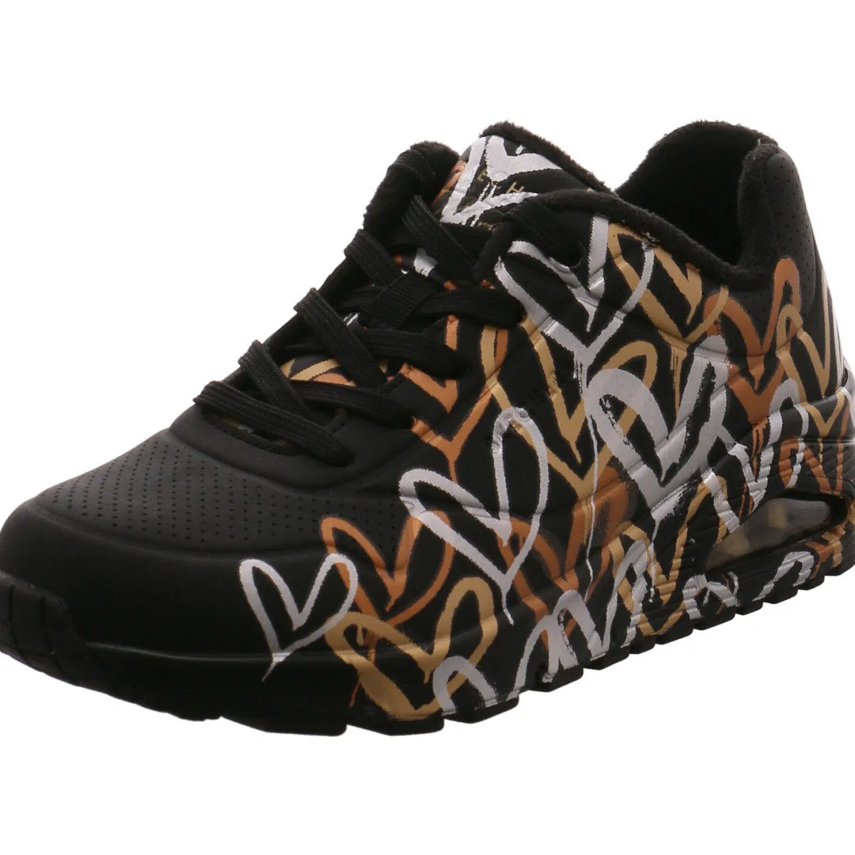 Das Obermaterial aus Kunstleder in Schwarz ist mit einem tollen Herzmuster in Gold und Silber versehen. Das auffällige Design des Sneaker ist aus der Zusammenarbeit des international bekannten Wandmalers James Goldcrown und Skechers entstanden.