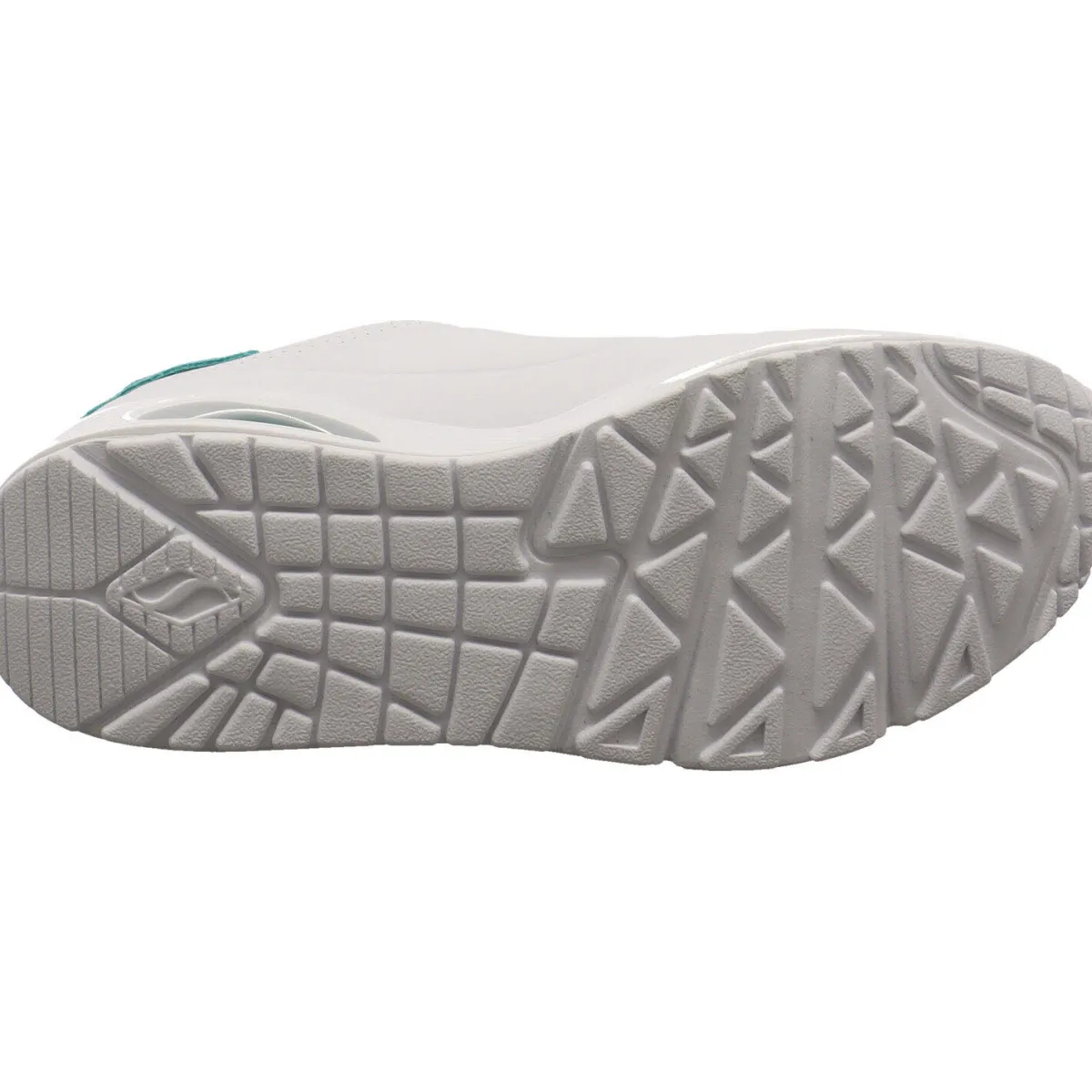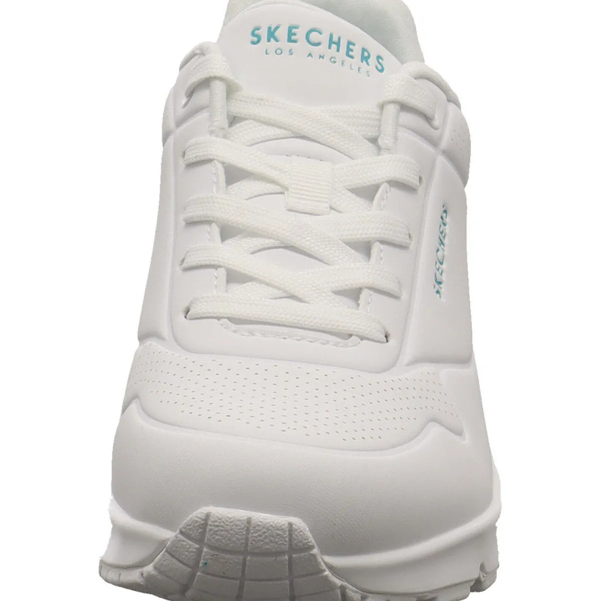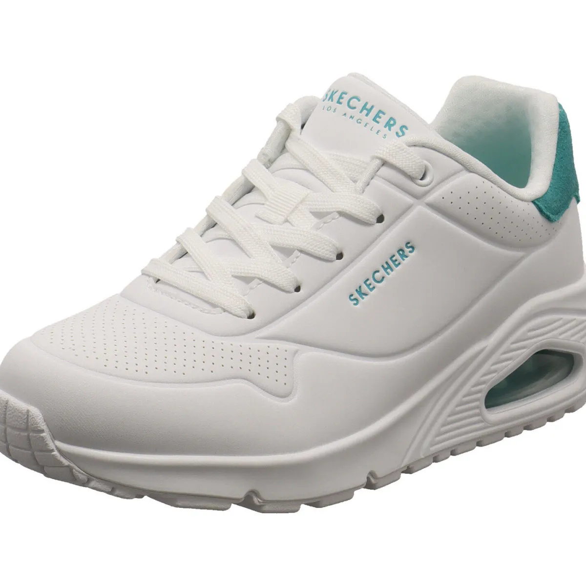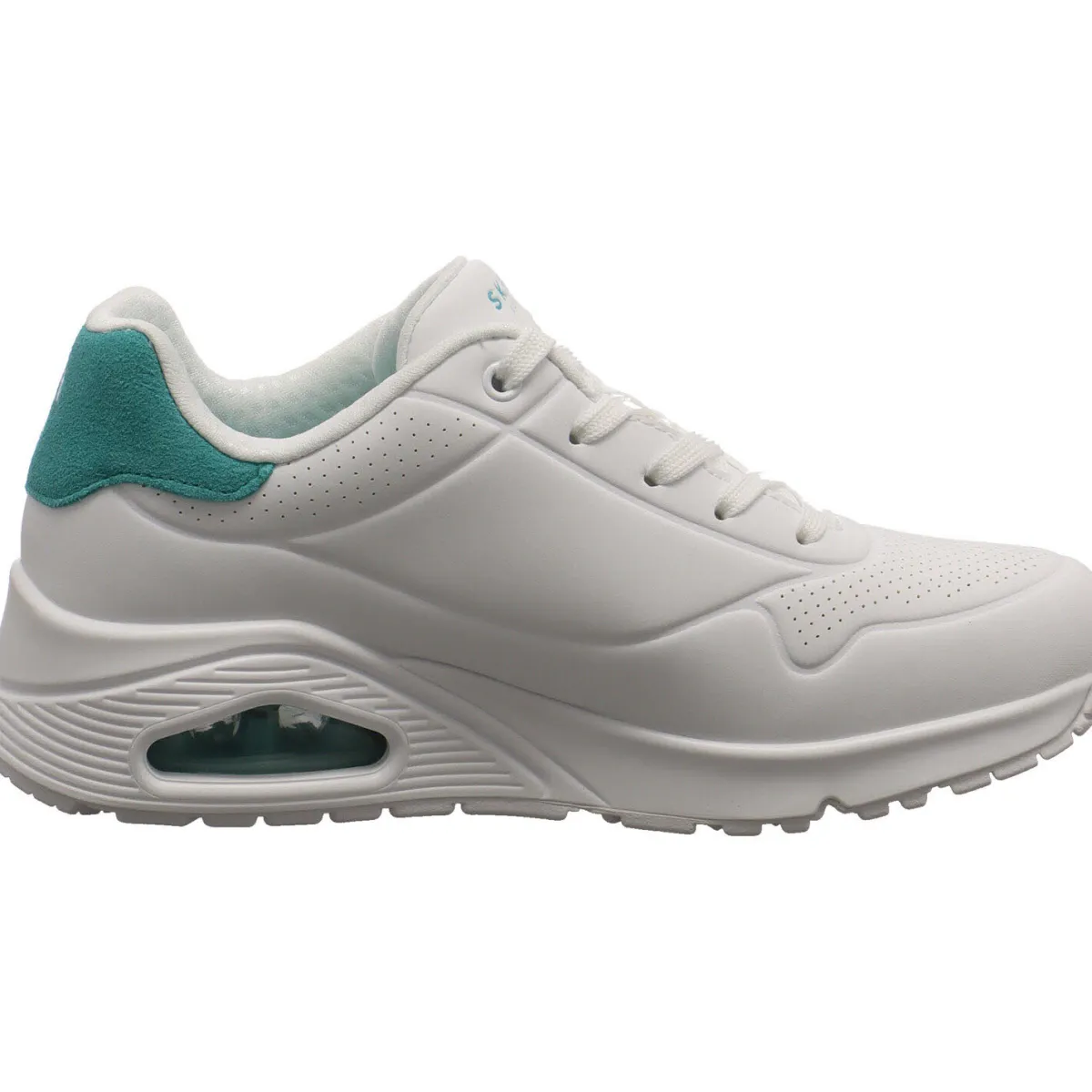 Das Obermaterial aus Kunstleder in Weiß ist mit kleinen Lasercuts und Farbakzenten in Türkis versehen. Der Schaft ist angenehm gepolstert und durch die Schnürung kann der Schuh optimal an den Fuß angepasst werden.