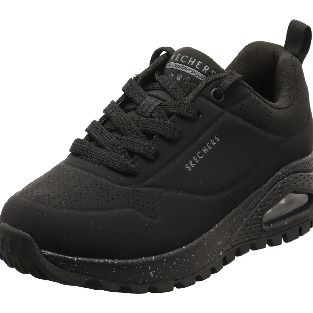 Der Damen Sneaker Uno Rugged – Spotted Terrain, von Skechers Street wurde aus Kunstleder in Schwarz gefertigt. Dabei ist das Obermaterial so gearbeitet, dass es Wasserdicht ist. Regen und nasse Wiesen sind also kein Problem. Er ist mit kleinen Lasercuts versehen. Der Schaft ist angenehm gepolstert und mit der Lasche und der Schnürung ist der Einstieg ganz leicht und die Passform kann optimiert werden. Die Air Cooled Memory Foam Innensohle passt sich dabei perfekt deiner Fußform an und sorgt für ein optimales Klima im Schuh. Auch hier findest du die integrierte Skech Air Luftkissen-gedämpfte Zwischensohle. Der ideale Begleiter auch bei Schmuddelwetter.