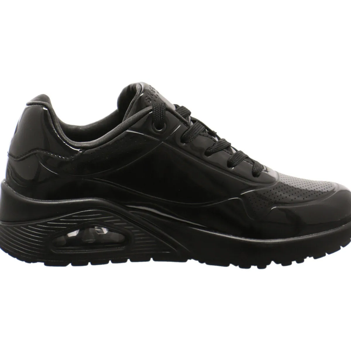 Das Obermaterial aus Kunstleder ist in einem klassischen Schwarz in Lack Optik gestaltet und wird mit Ziernähten und Perforations-Akzenten optisch aufgewertet.