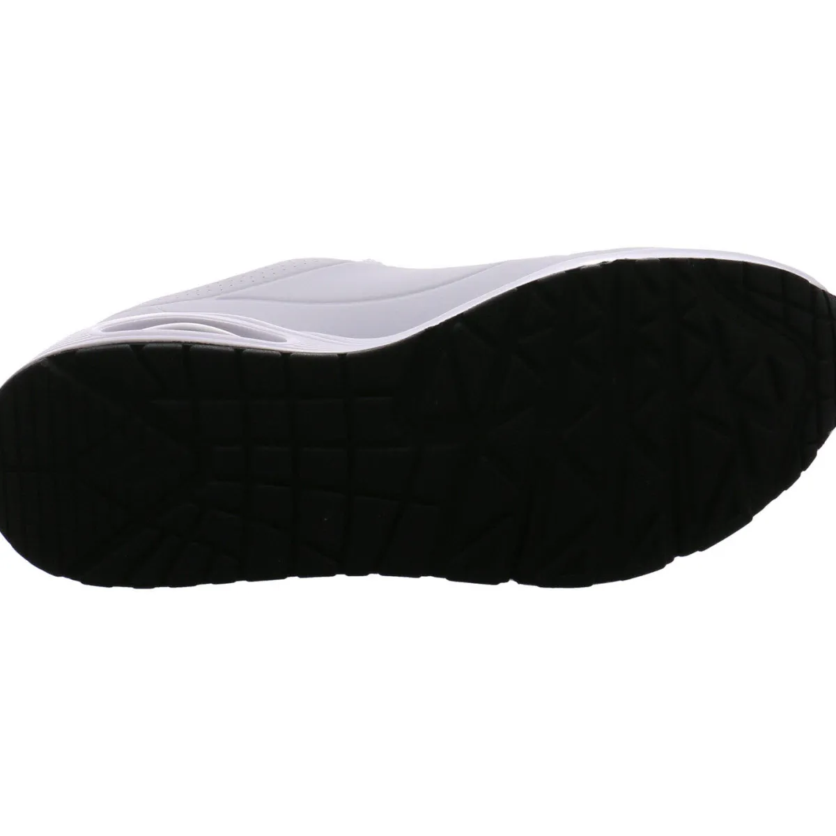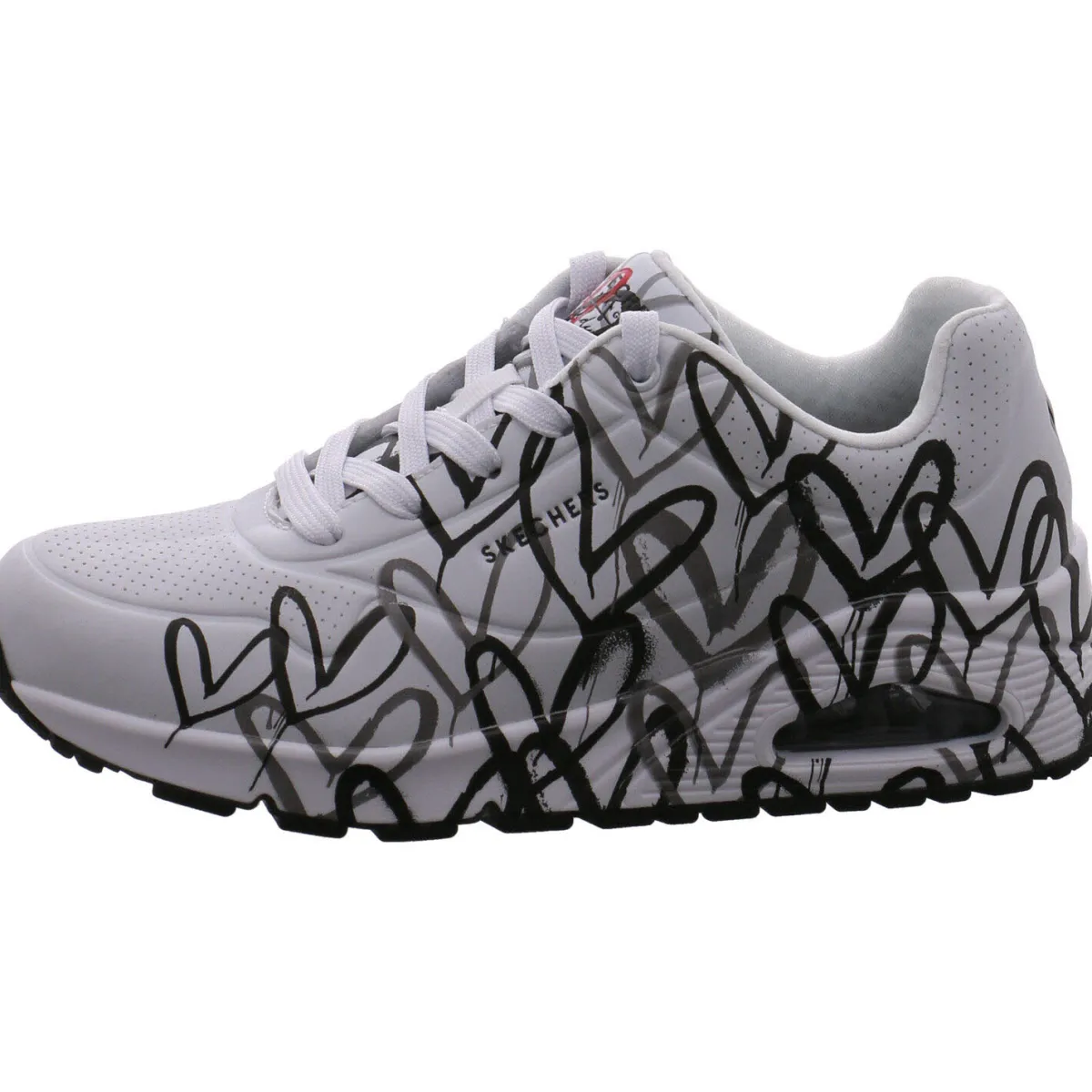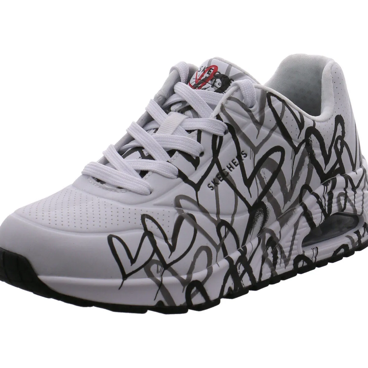 Das Obermaterial aus Kunstleder in Weiß ist mit einem tollen Herzmuster in Schwarz versehen. Das auffällige Design des Sneaker ist aus der Zusammenarbeit des international bekannten Wandmalers James Goldcrown und Skechers entstanden.