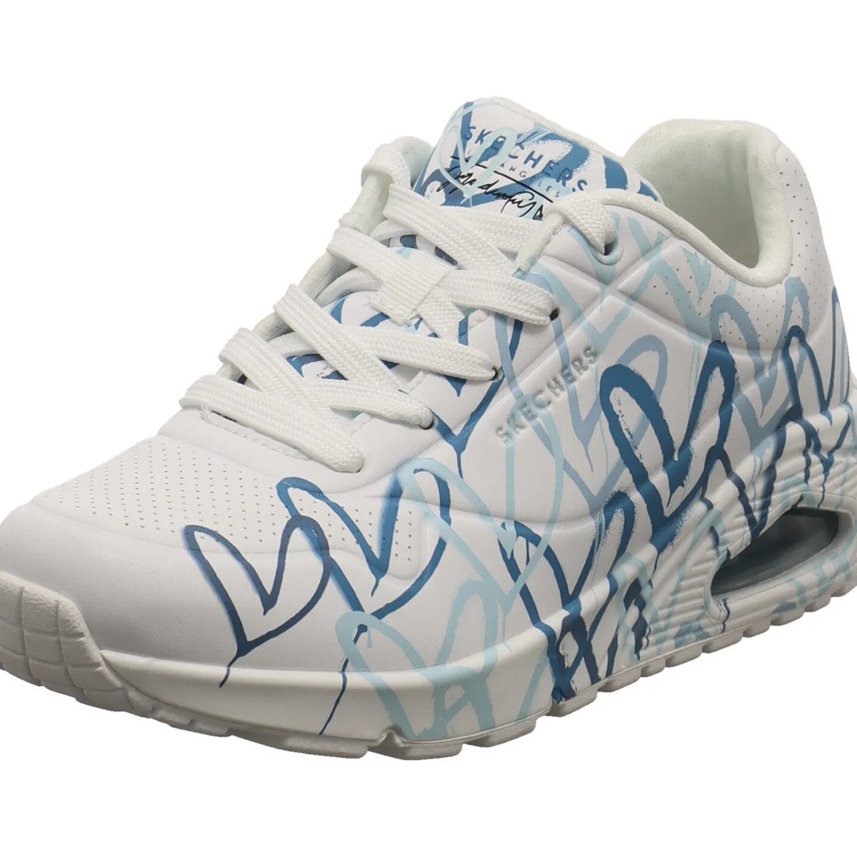 Das Obermaterial aus Kunstleder in Weiß ist mit einem tollen Herzprint in Blau versehen. Das auffällige Design des Sneaker ist aus der Zusammenarbeit des international bekannten Wandmalers James Goldcrown und Skechers entstanden.