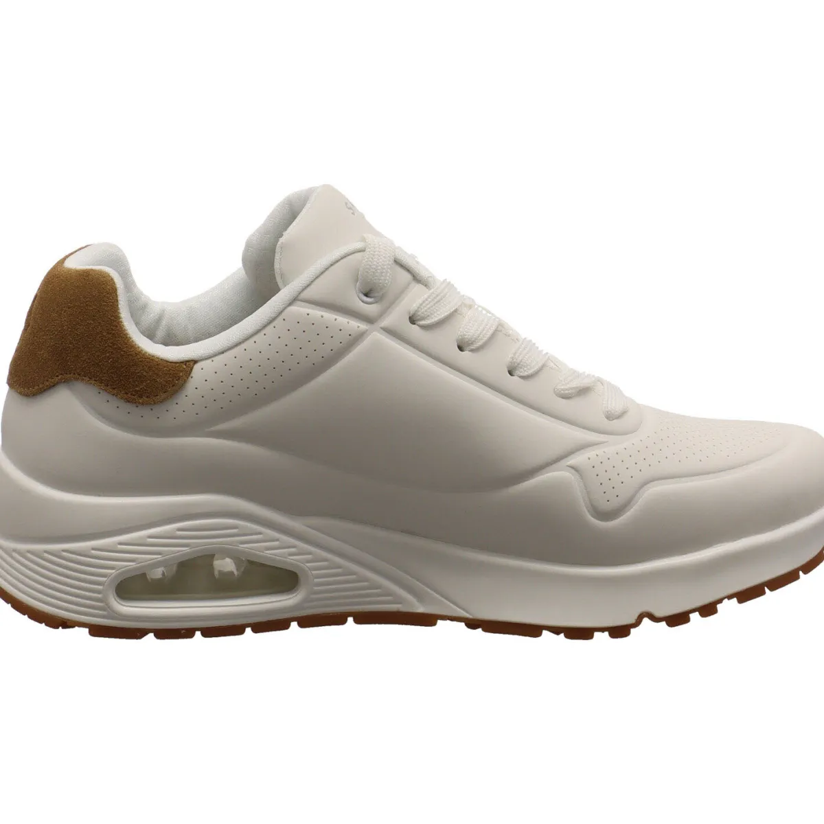 Der Schuh begeistert durch seinen cleanen Look, durch das Kunstleder in Weiß. Als Highlight, sind auf dem Blatt und seitlich vom Schaft kleine Lasercuts angebracht. Die Rückseite vom Schaft ist Braun abgesetzt. Die Skechers Air-Cooled Memory Foam Einlegesohle und eine sichtbare luftgepolsterte Skech-Air Zwischensohle sorgen für optimalen Komfort. Der Schaft ist angenehm gepolstert und durch die Schnürung kann der Schuh perfekt an den Fuß angepasst werden.