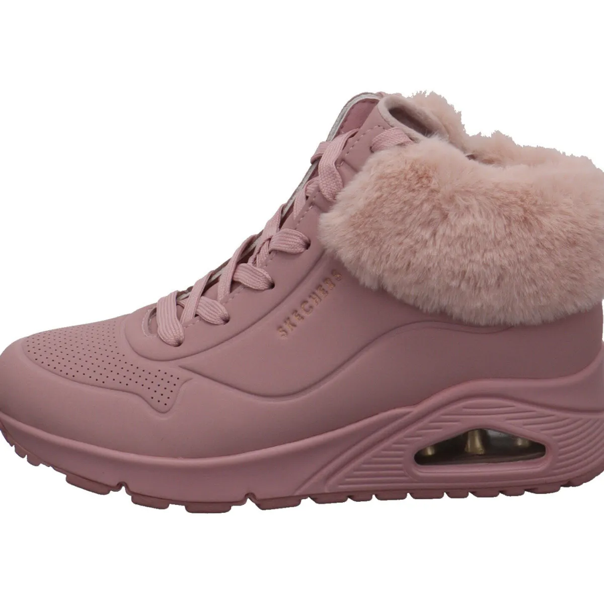 Er wurde aus Kunstleder in Rosa gefertigt und ist am Schaft mit einem weichen Plüschrand gearbeitet. Durch den seitlichen Reißverschluss ist der Einstieg Kinder leicht und mit der Schnürung kann er genau an den Fuß angepasst werden. Auch hier wurde die bekannte Skechers Air Cooled Memory Foam Innensohle verarbeitet. Zusammen mit der luftgepolsterten Zwischensohle, sorgt sie für einen tollen Tragekomfort.