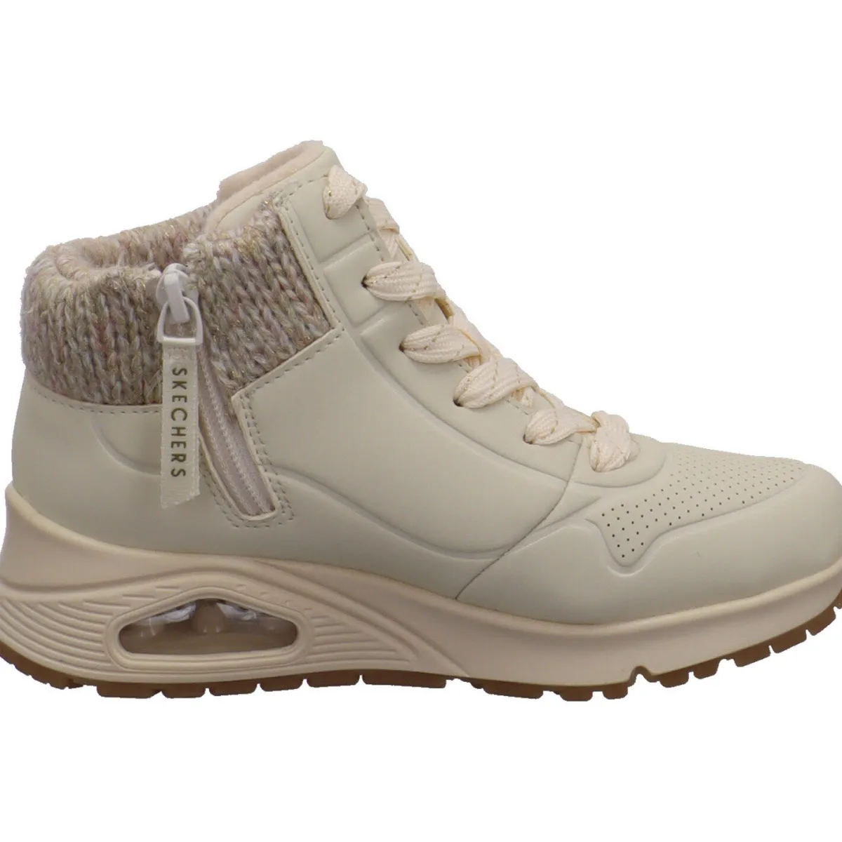 Er wurde aus Kunstleder in Beige gefertigt und ist am Schaft mit einem weichen Strickbund mit Glitzer Faden und kleinen Lasercuts auf dem Obermaterial gearbeitet. Durch den seitlichen Reißverschluss ist der Einstieg Kinder leicht und mit der Schnürung, welche auch den Glitzer Faden hat, kann er genau an den Fuß angepasst werden. Auch hier wurde die bekannte Skechers Air Cooled Memory Foam Innensohle verarbeitet. Zusammen mit der luftgepolsterten Zwischensohle, sorgt sie für einen tollen Tragekomfort.