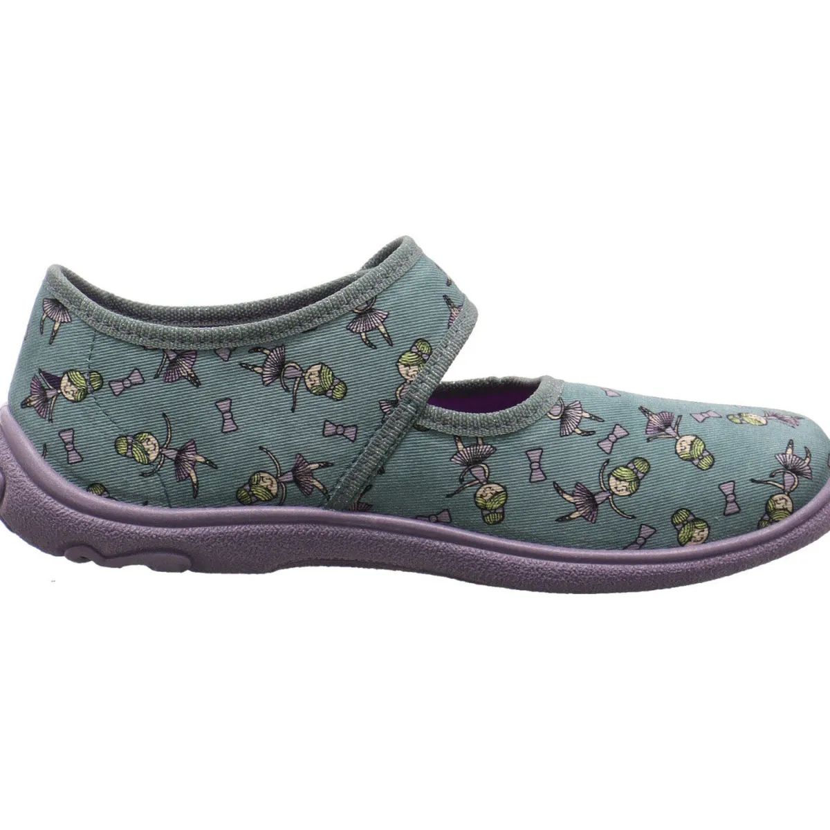 Gefertigt aus Textil in Grün mit einem Allover Print einer Ballerina, bietet er besten Komfort und begeistert jedes Mädchen. Durch die flexible und anatomisch geformte Laufsohle und dem verstellbaren Klettverschluss lässt sich der Schuh optimal den Kinderfüßen anpassen und ist zudem besonders leicht.