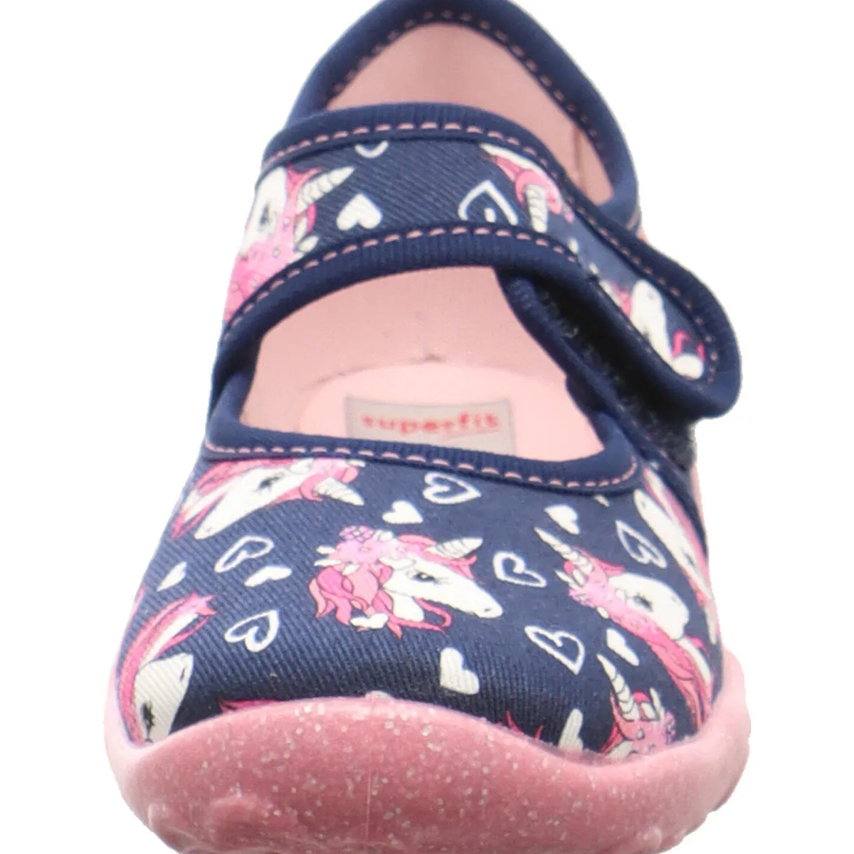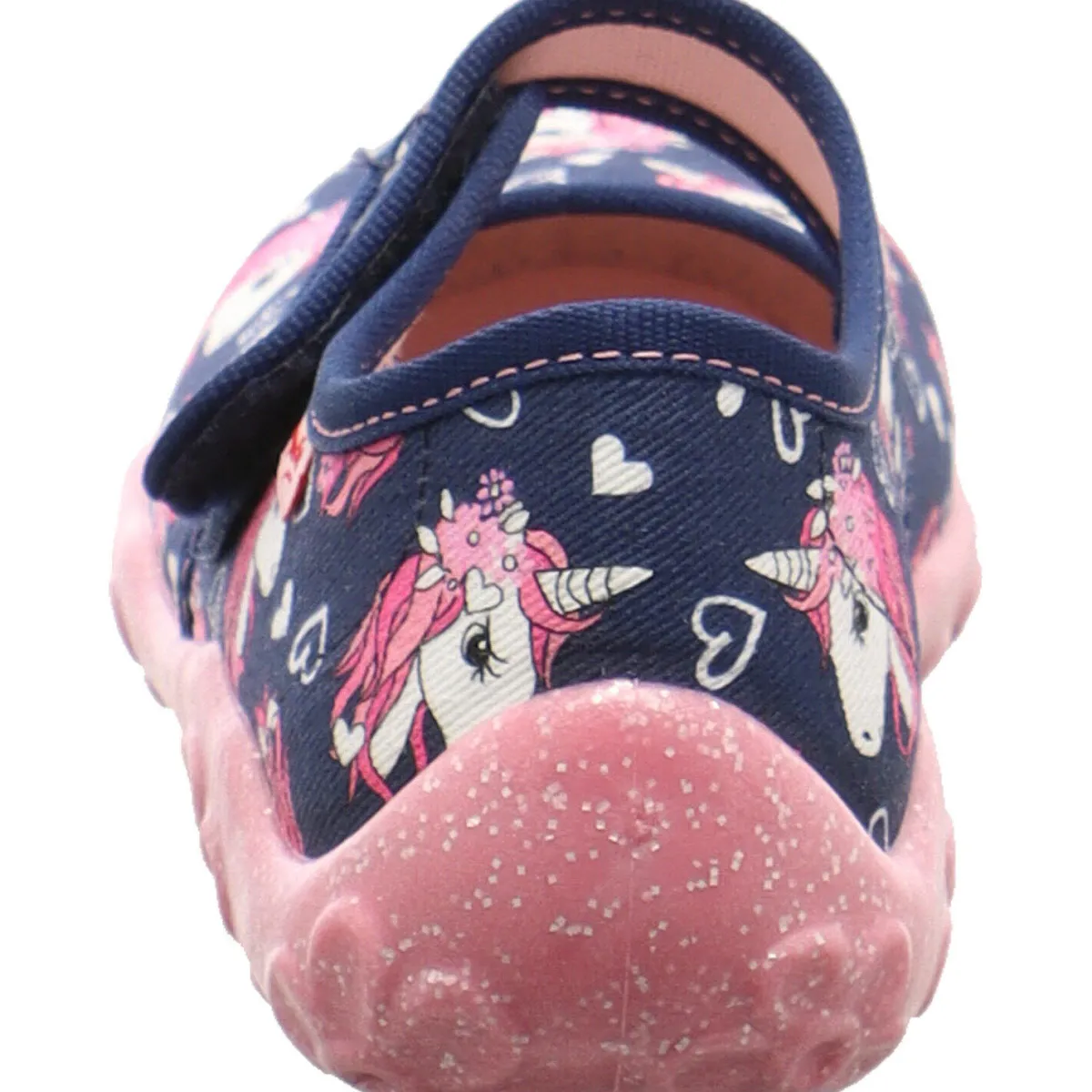 Gefertigt aus Textil in Blau mit einem süßen Einhorn Print mit kleinen Herzen in Rosa auf dem Blatt, bietet er schon kleinen Füßen besten Komfort und begeistert jedes Mädchen.