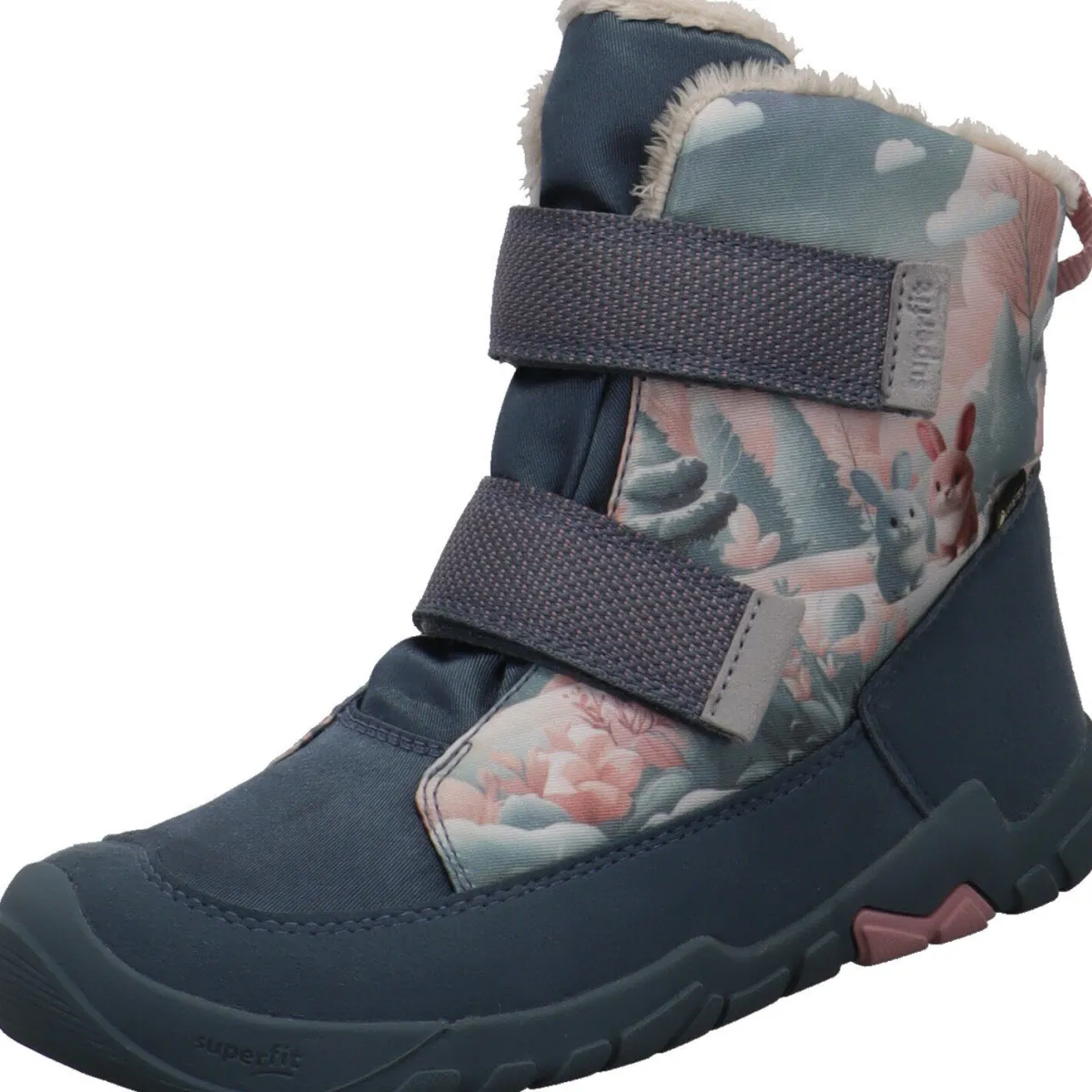 Er wurde aus Textil in Blau gearbeitet und hat als tollen Eyecatcher an der Seite vom Schaft ein Motiv einer Winterlandschaft mit zwei kleinen Hasen.