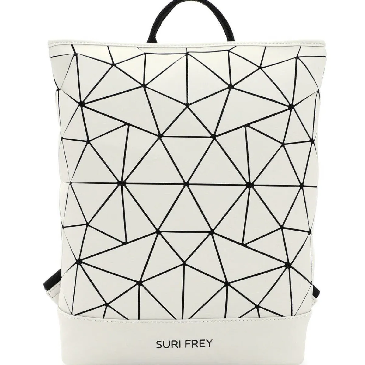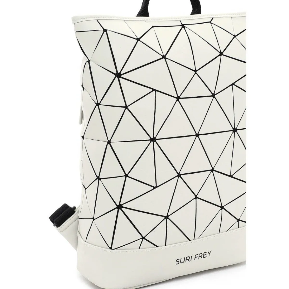 Das Obermaterial aus Kunstleder erhält durch das Geometrische Muster in Ecru Beige eine stylische Mix-Optik und macht den Rucksack zum absoluten Hingucker.