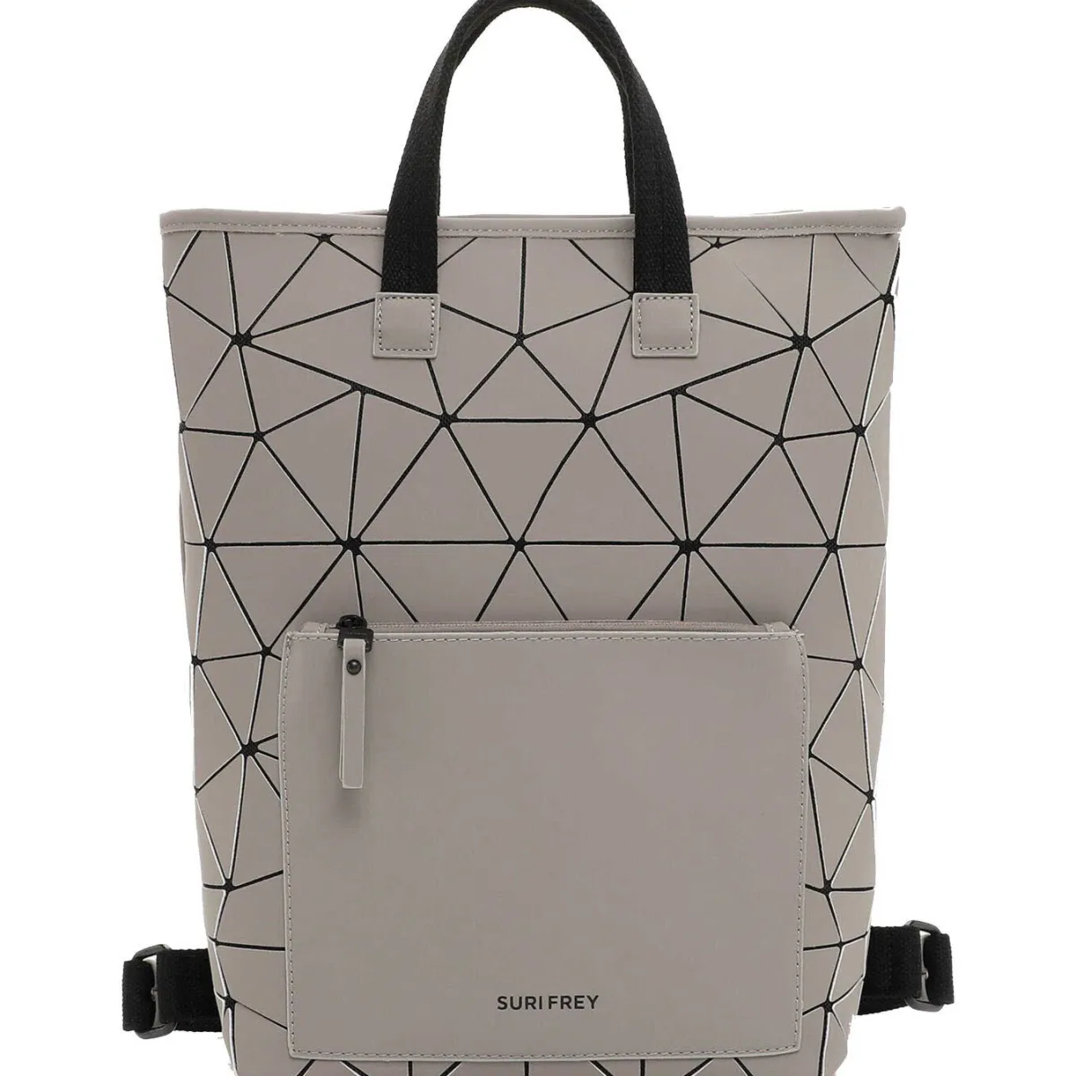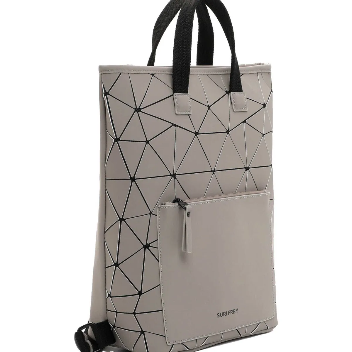 Das Obermaterial aus Kunstleder erhält durch das Geometrische Muster in Taupe Grau eine stylische Mix-Optik und macht den Rucksack zum absoluten Hingucker.