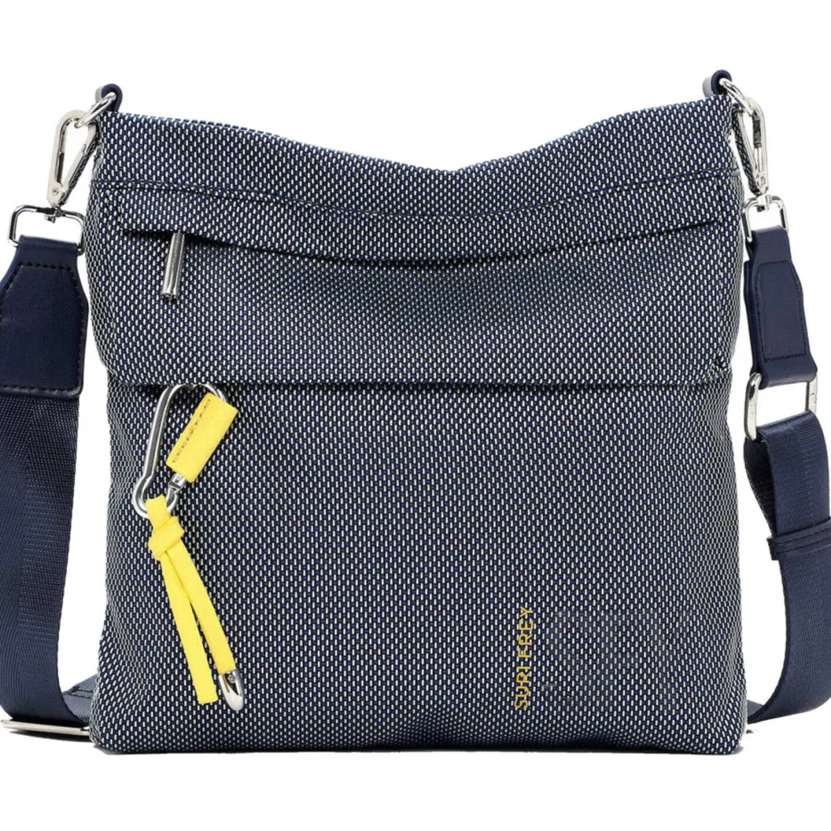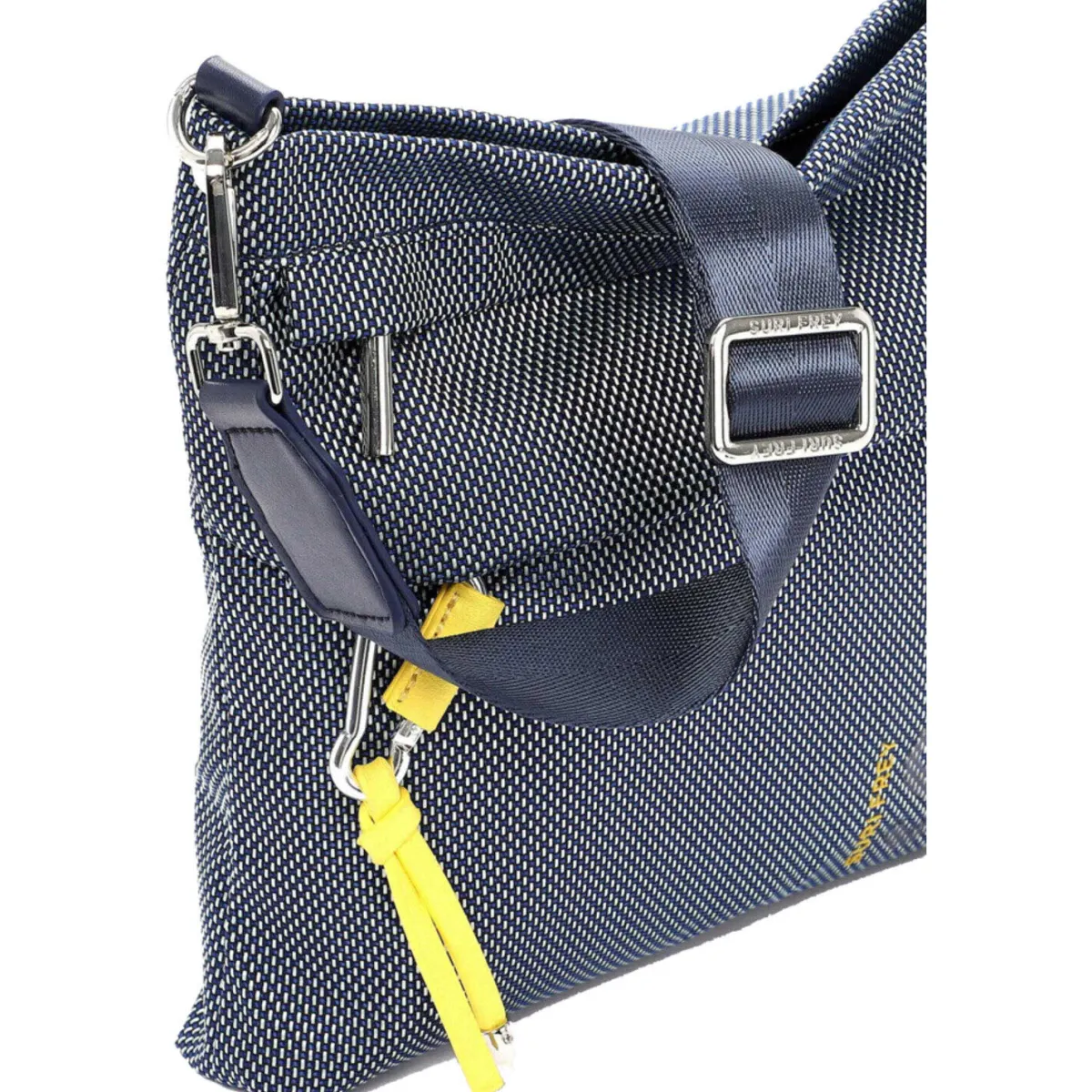 Edel verarbeitetes Material aus Nylon in Blau wurde mit einer Web-Optik und einem zweifarbigem Design versehen, das die Umhängetasche zu einen absoluten Hingucker macht.