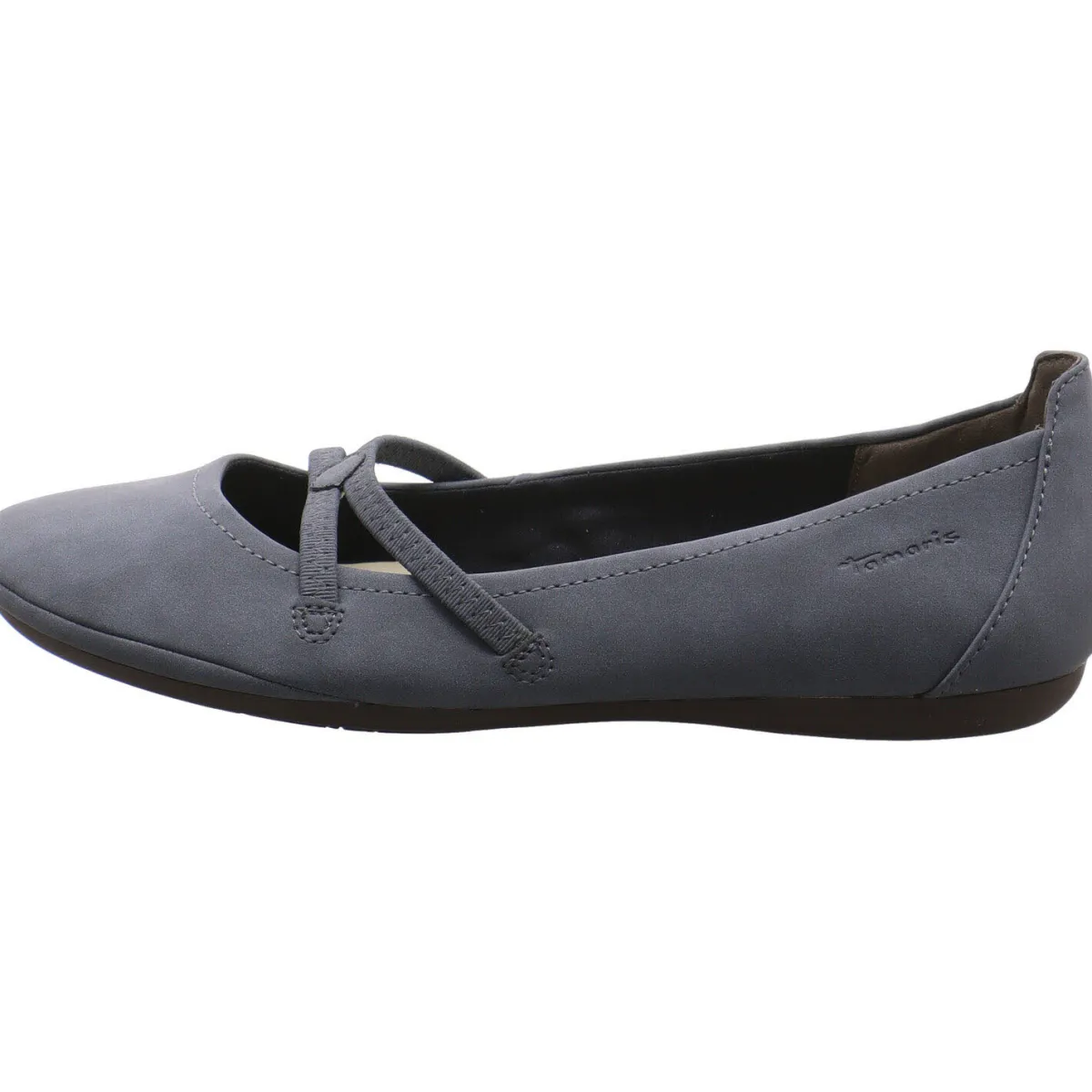 Aus Kunstleder in Blau gefertigt ist er auf dem Rist mit zwei Gummibändern verziert. Diese geben zusätzlich Halt und geben dem Schuh seinen besonderen Look. Die Inensohle ist angenehm weich und die Fersenkappe etwas höher gearbeitet. Sie bietet dir zusätzlich einen guten Halt.